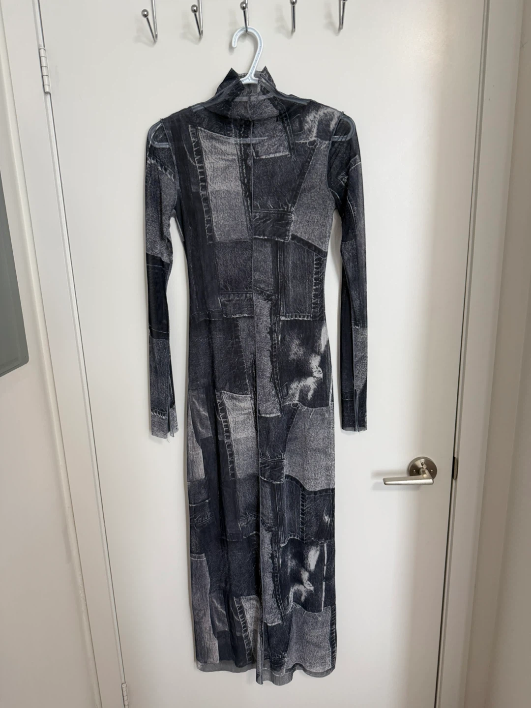 Grey patchwork print sheer mock neck dress. Long sleeves with a slim fit. Lining underneath. There's a small snag on the seam.