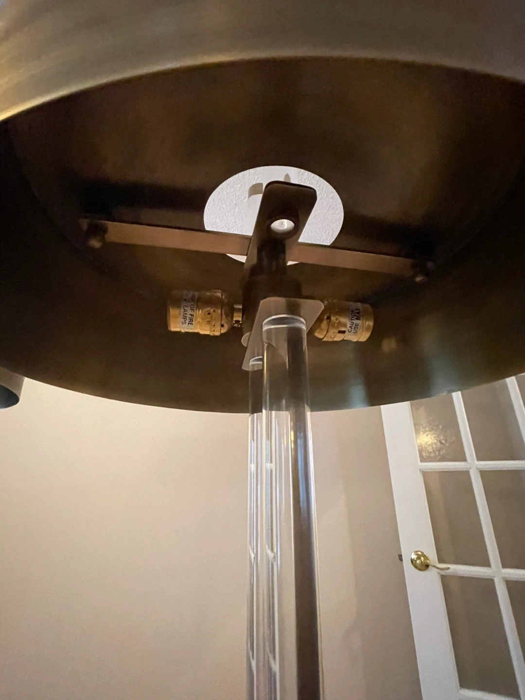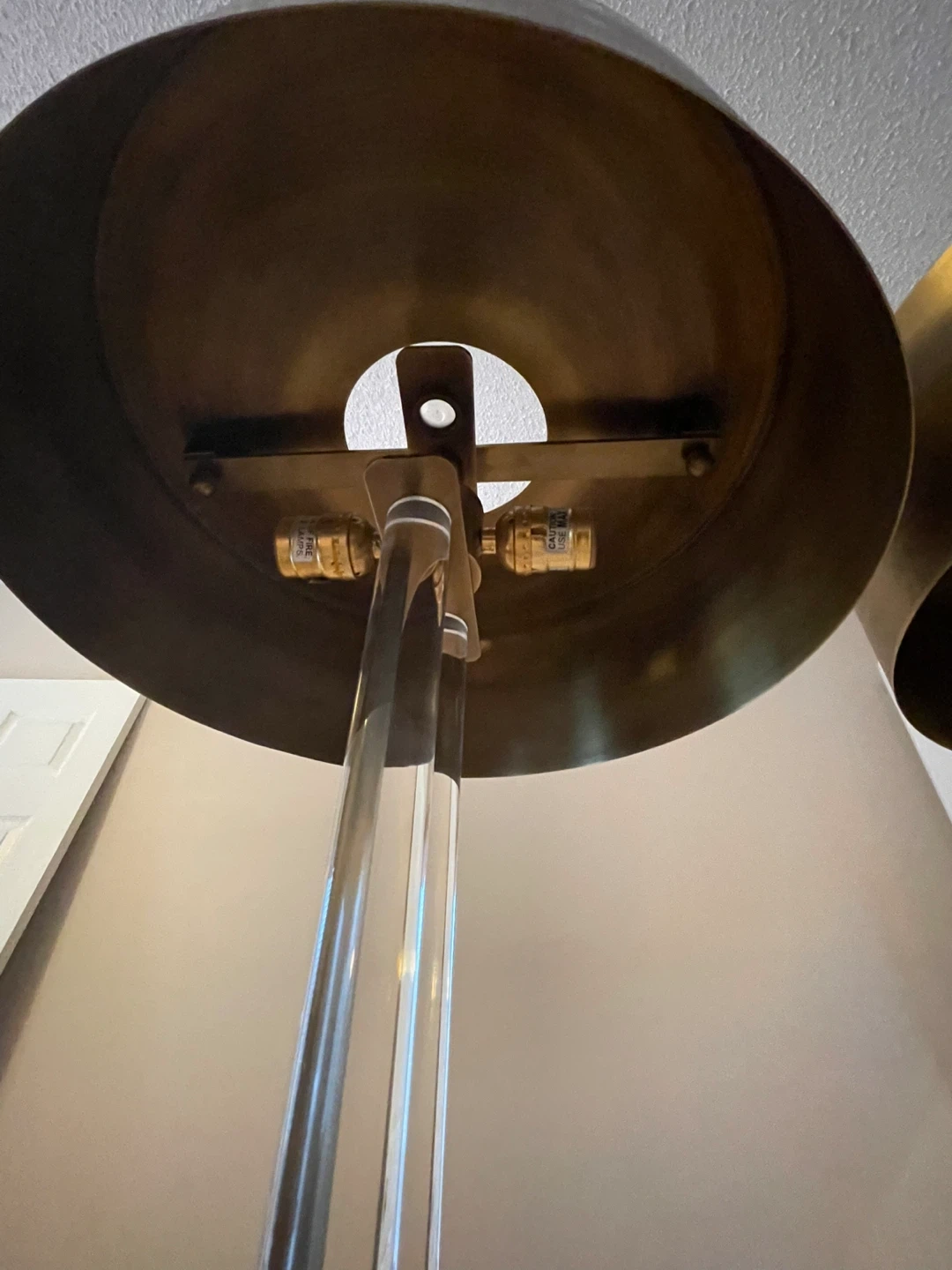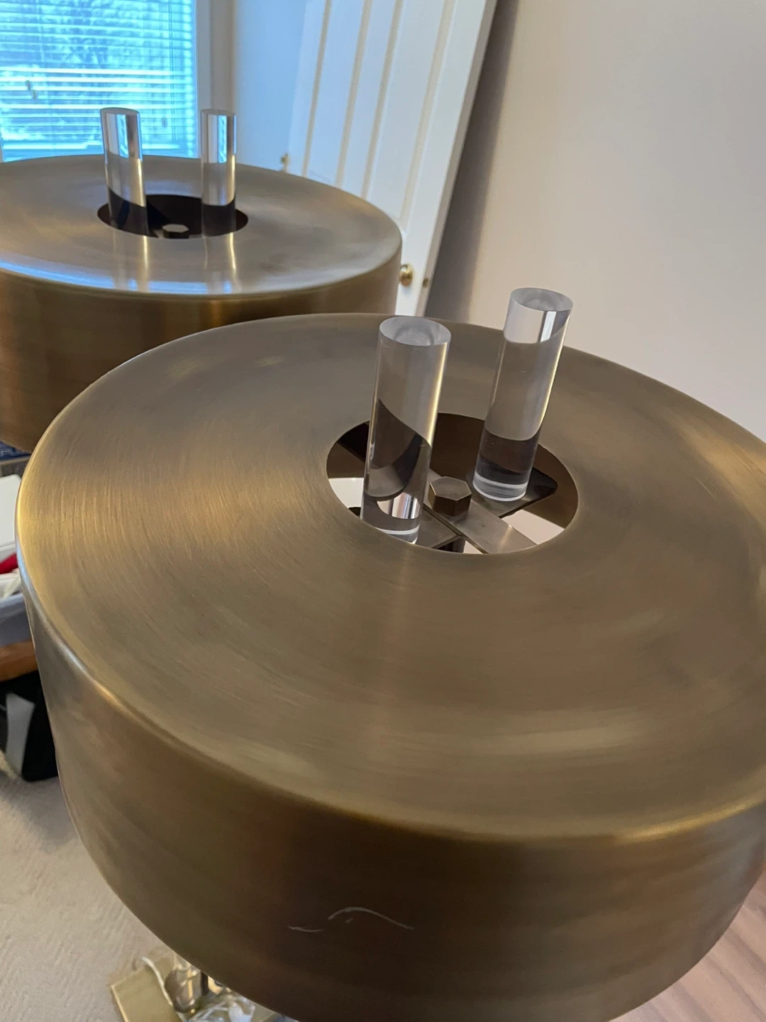 These floor lamps feature clear acrylic tubes with brass accents and a brass drum shade. They'd be a stylish addition to any living room. The dimensions are approximately 60 inches tall with a 15-inch shade diameter.