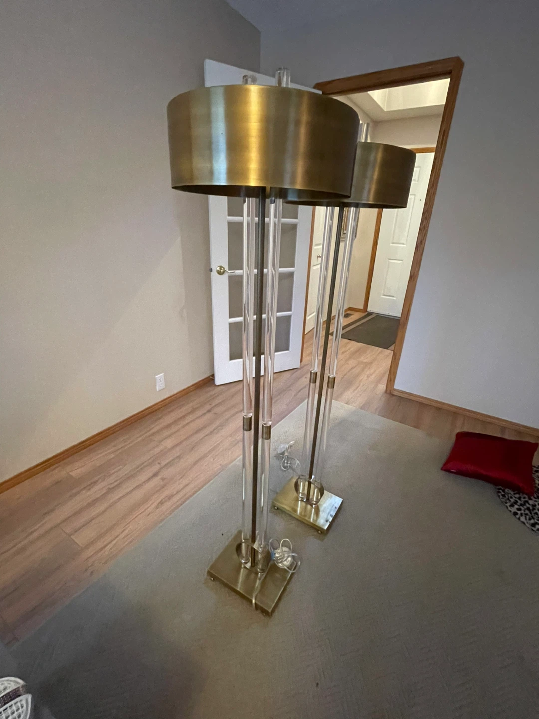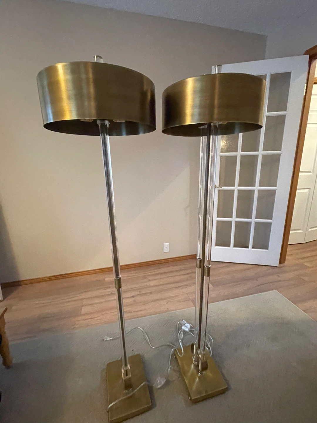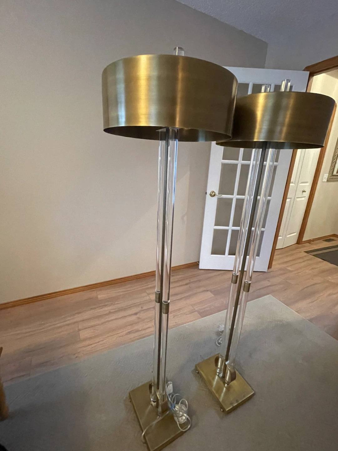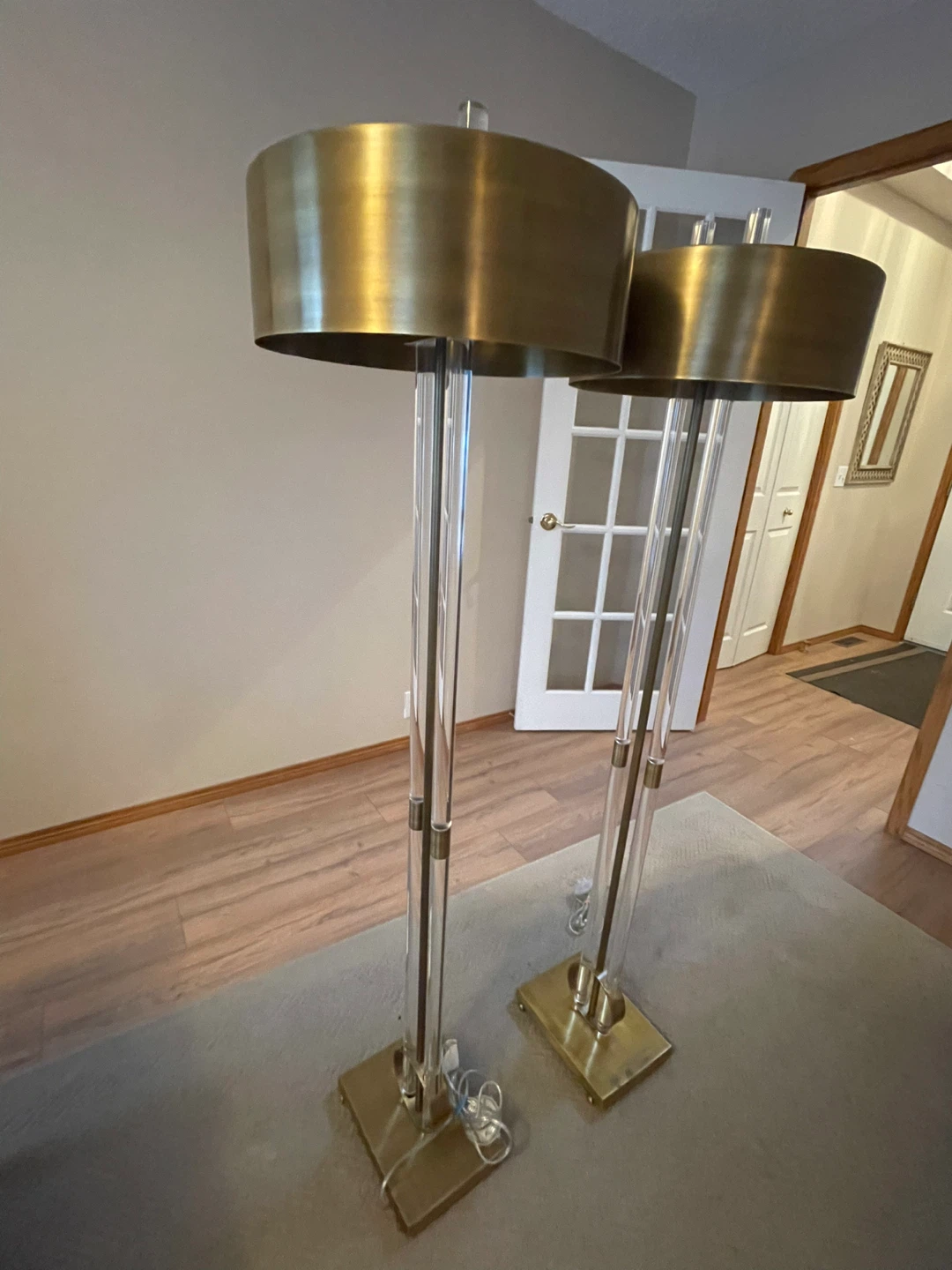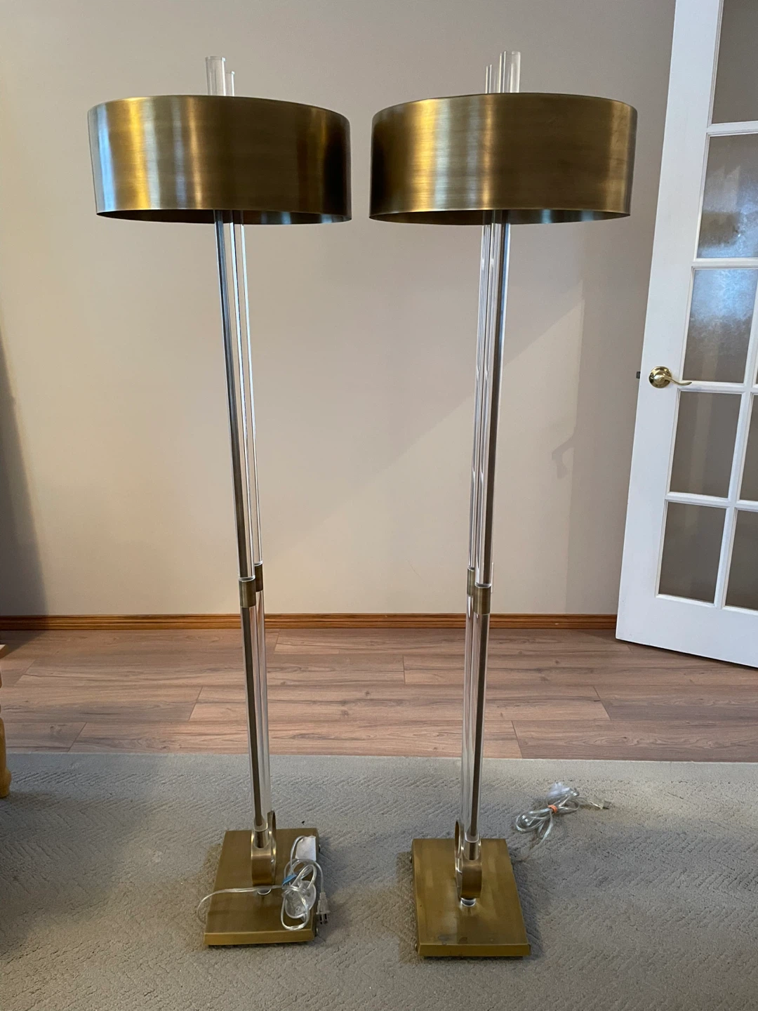 These floor lamps feature clear acrylic tubes with brass accents and a brass drum shade. They'd be a stylish addition to any living room. The dimensions are approximately 60 inches tall with a 15-inch shade diameter.