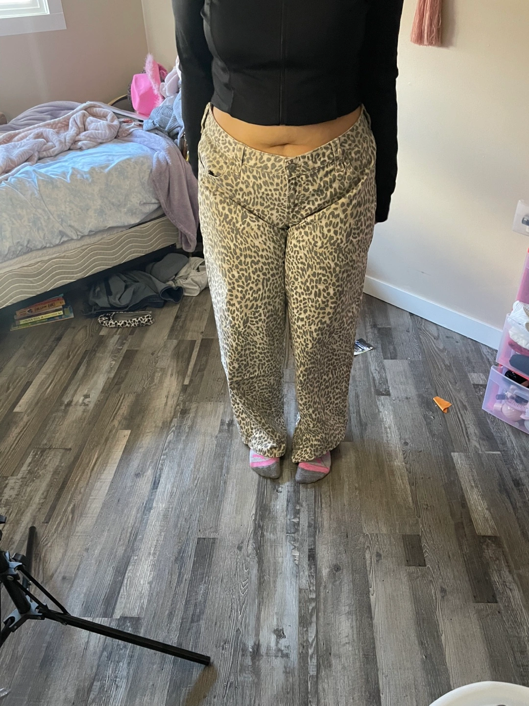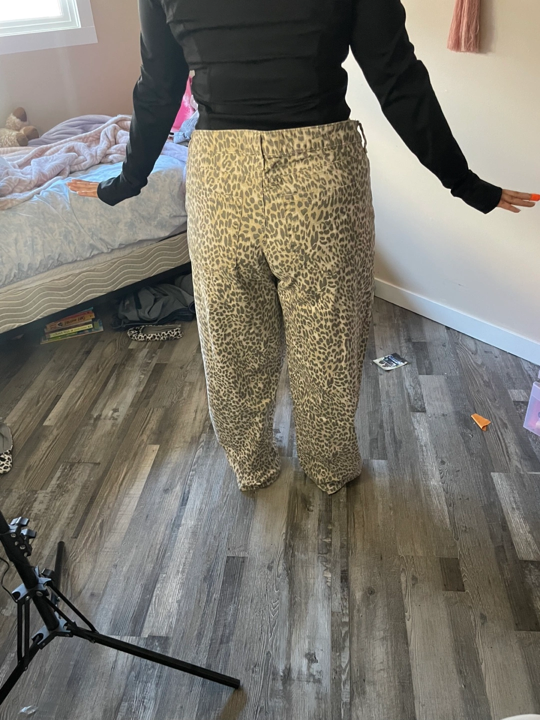 Size 16R, W33 Regular. Low-rise, super baggy fit. Leopard print. Made in Bangladesh.super soft and stretchy