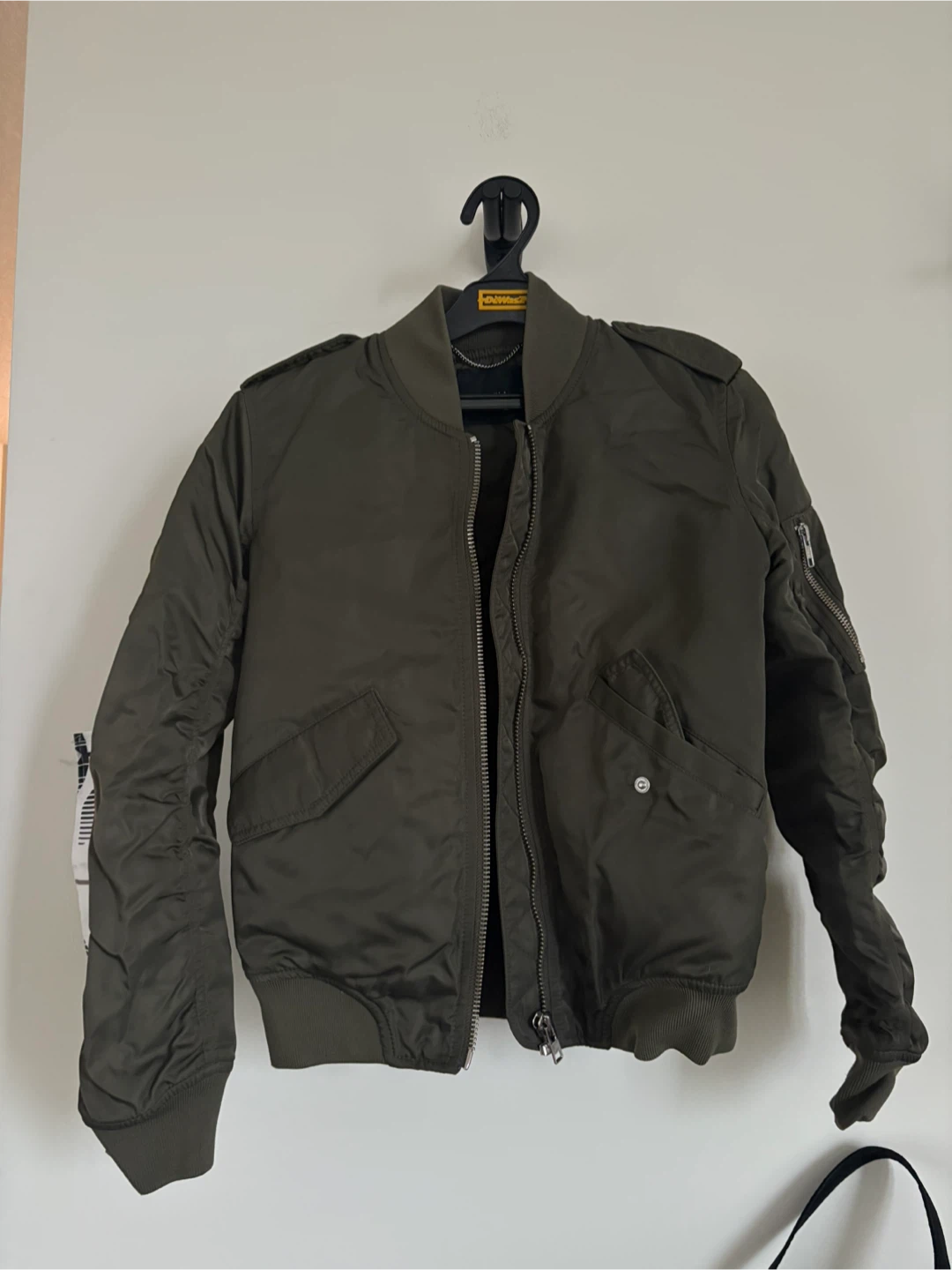 Selling a bomber jacket in olive green! It's in great condition and perfect for layering. A stylish and versatile piece for any wardrobe