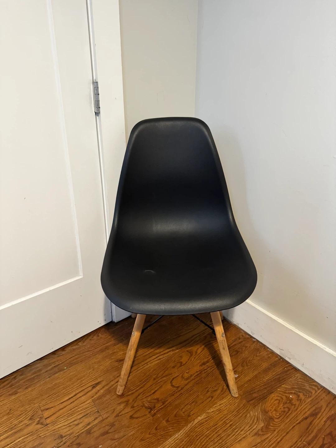 This is a black accent chair with a molded seat and four wooden legs. It's designed for a modern aesthetic. The seat is made of durable plastic.