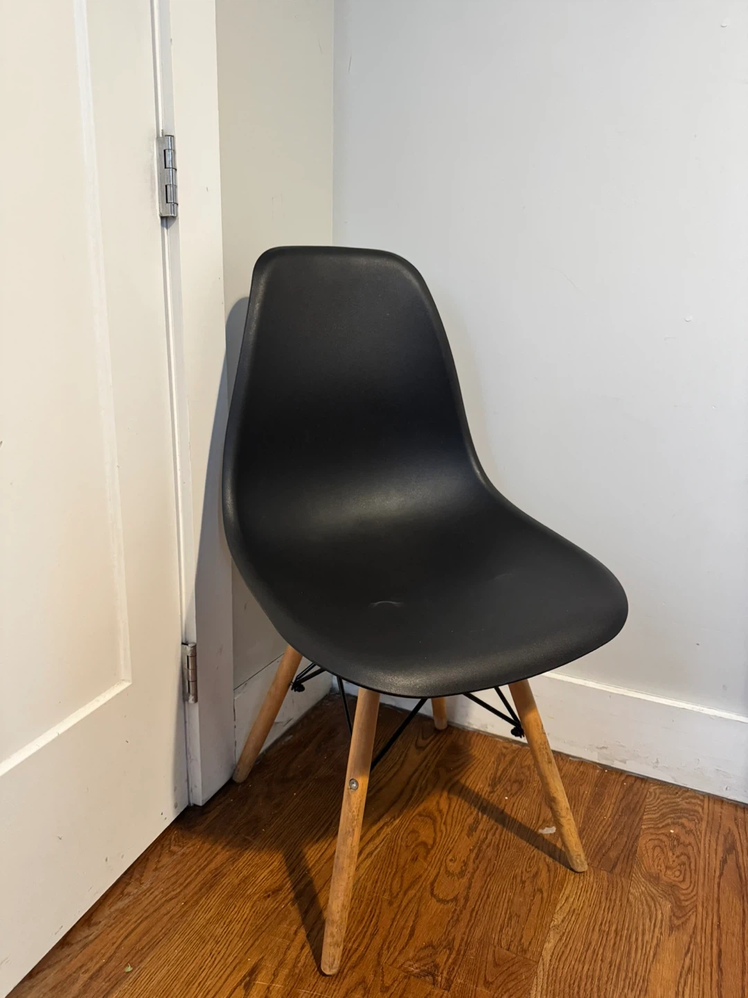 This is a black accent chair with a molded seat and four wooden legs. It's designed for a modern aesthetic. The seat is made of durable plastic.