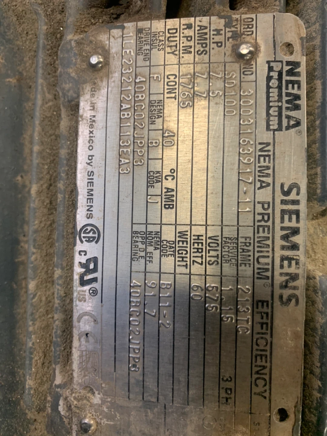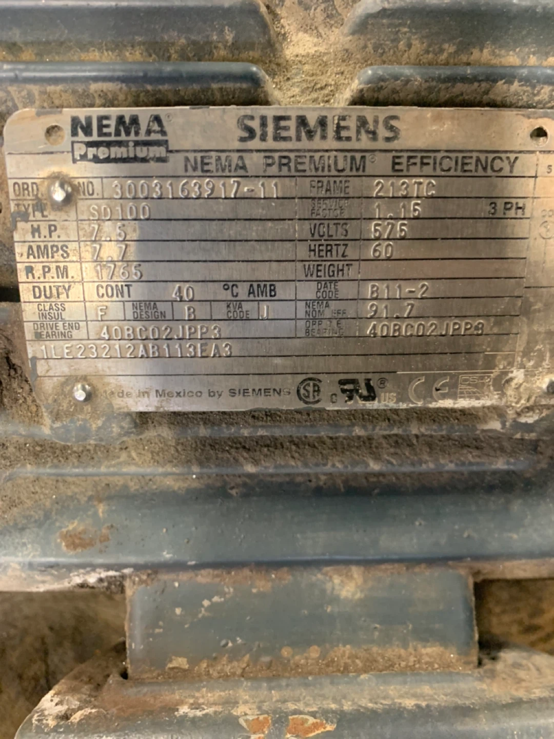 Selling a Siemens NEMA Premium Efficiency electric motor. The motor has a horsepower of 7.5, 1765 RPM, and operates at 575 volts with 7.7 amps. It's a 3-phase motor with a frame size of 213TC. The motor's design is B and it has a continuous duty rating. It was made in Mexico by Siemens.