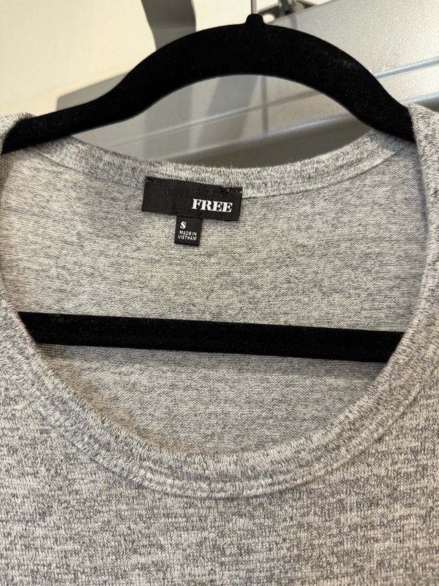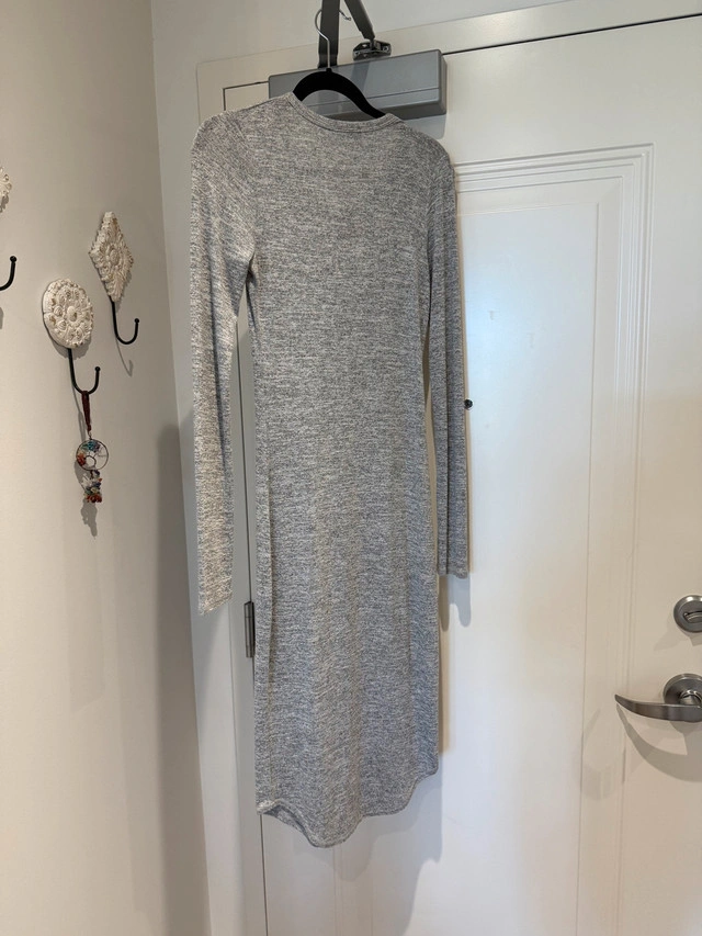 This is a Free brand grey long sleeve dress, size small. The dress is form fitting, yet comfortable. It's perfect for a casual day out or dressed up for an evening event.
