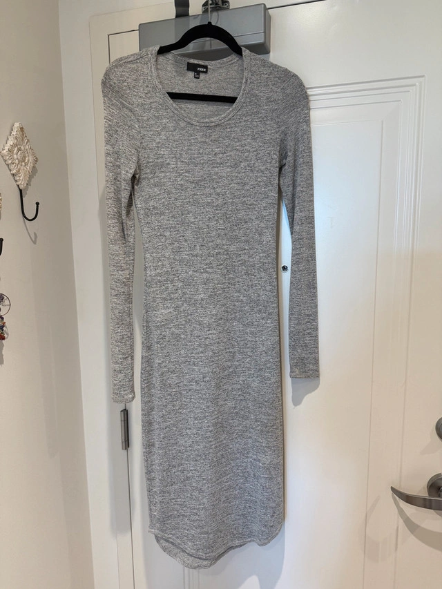 This is a Free brand grey long sleeve dress, size small. The dress is form fitting, yet comfortable. It's perfect for a casual day out or dressed up for an evening event.