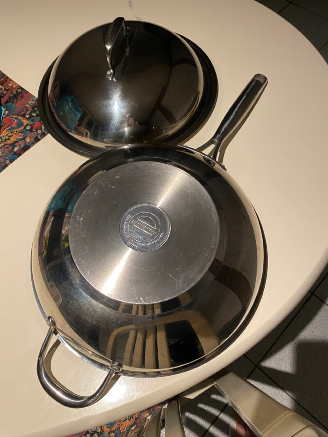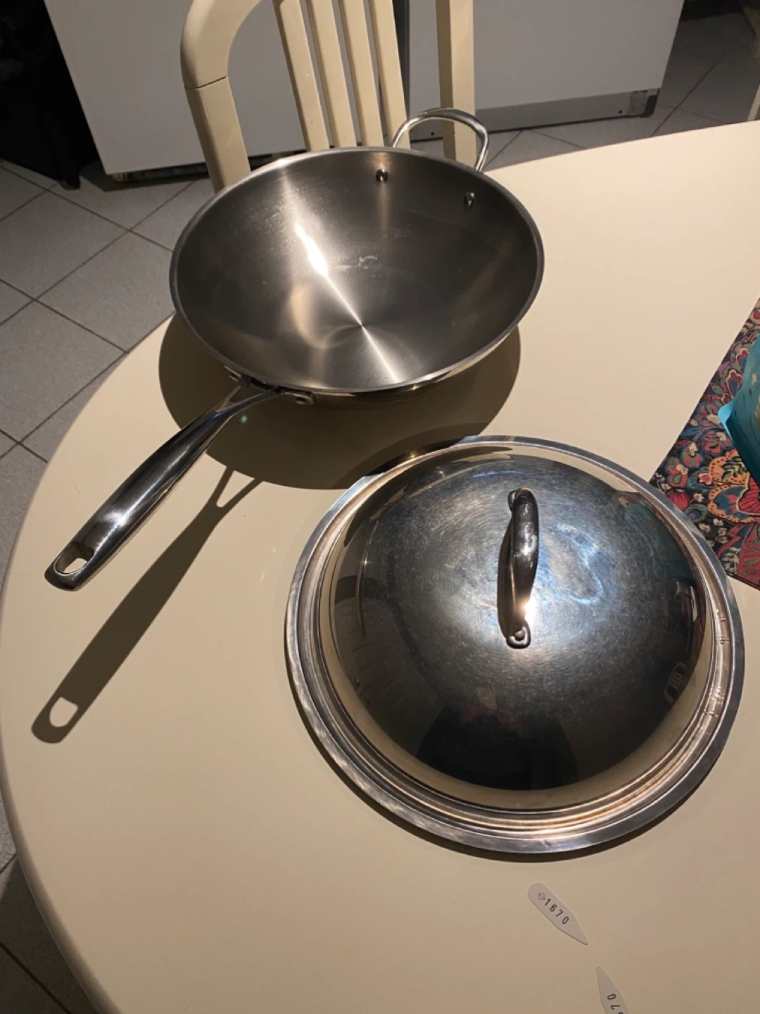 This Cuisinart stainless steel wok comes with a matching lid. It's made of durable stainless steel for excellent heat distribution. The wok's deep shape makes it handy for stir-frying or steaming! Like new only been used once or twice.