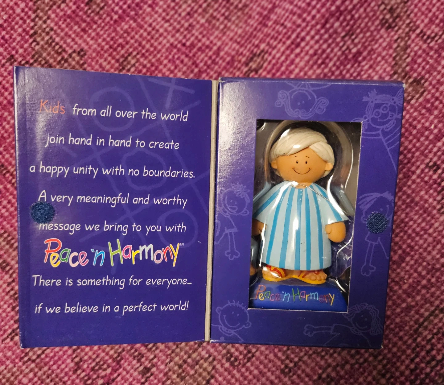 This figurine features a character from the Peace 'n Harmony collection, created by Imperial Creations Inc. It's made of resin and comes with its original box. The inscription on the base reads 'Peace 'n Harmony.