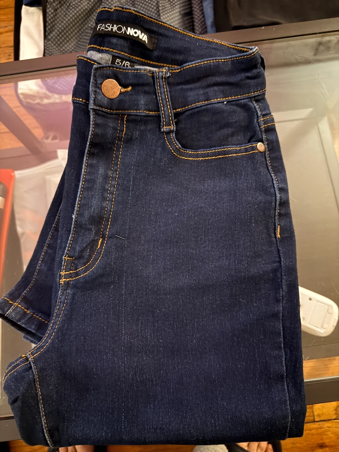 Fashion Nova women's skinny jeans in a dark wash. Made from 80% cotton, 15% polyester, and 5% elastane. These jeans offer a comfortable stretch fit. Size is 5/6.