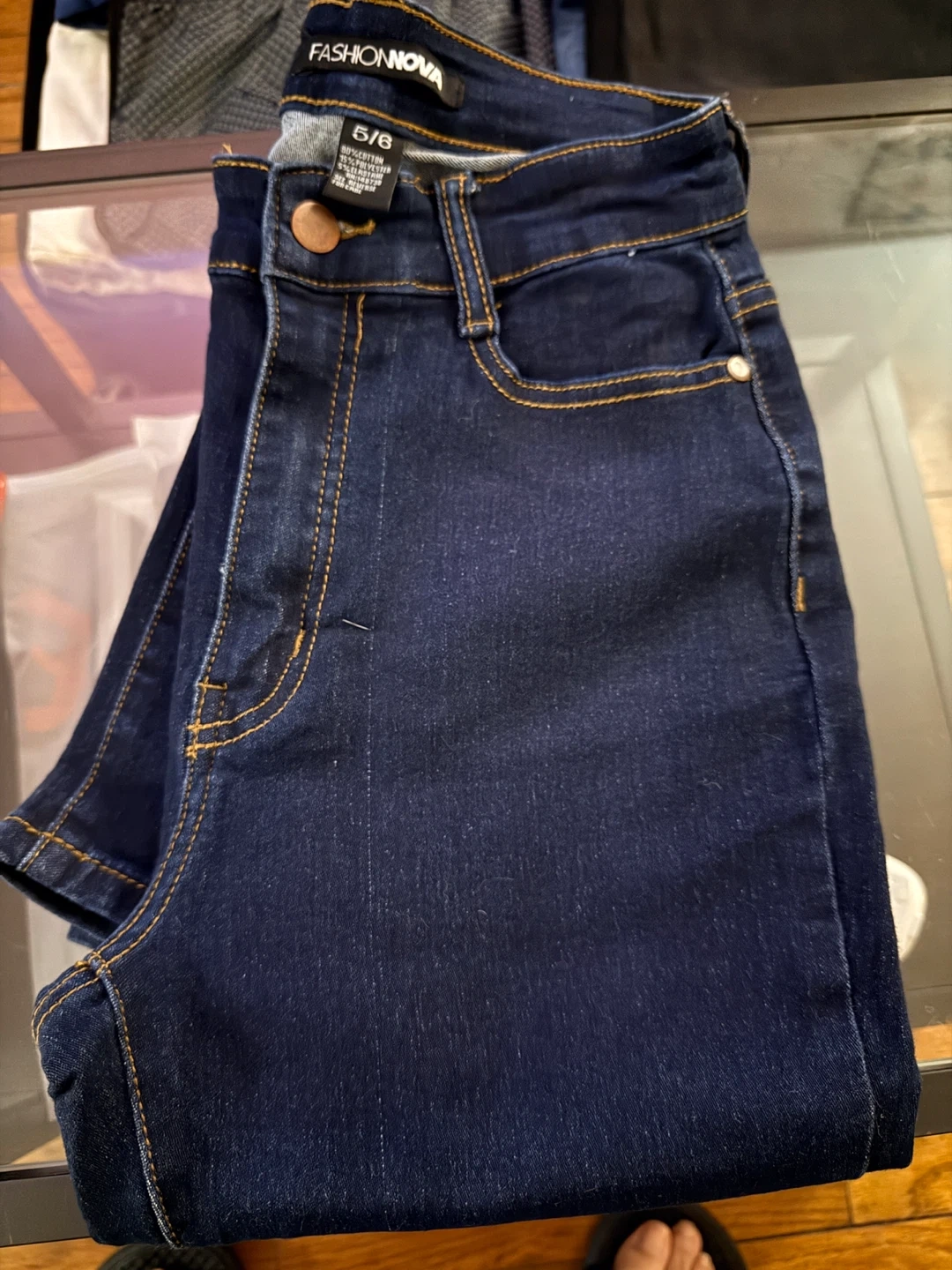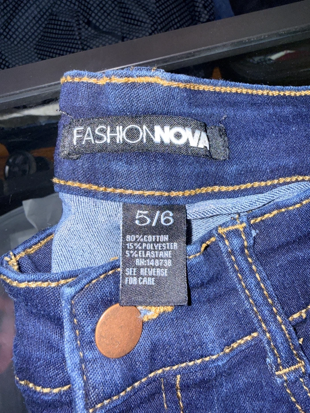 Fashion Nova women's skinny jeans in a dark wash. Made from 80% cotton, 15% polyester, and 5% elastane. These jeans offer a comfortable stretch fit. Size is 5/6.