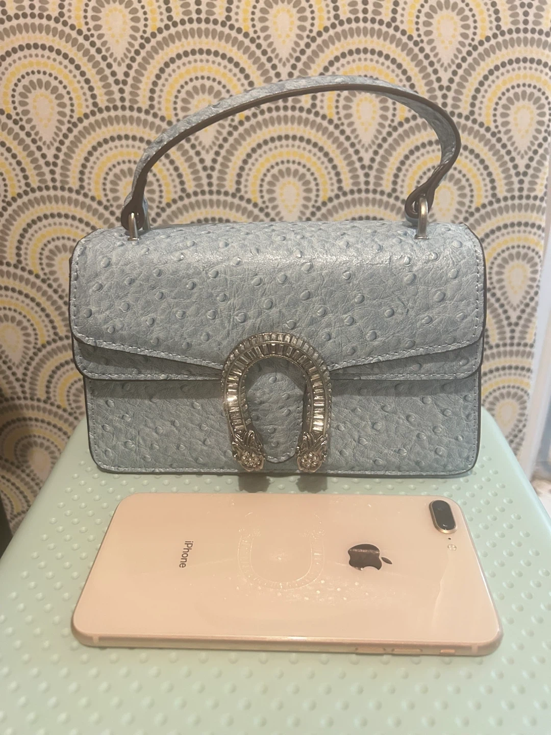 This light blue shoulder bag has a textured ostrich-like finish. It features a prominent U-shaped embellishment with rhinestones on the front flap. A top handle and a chain strap are included for versatile carrying options. Small size, perfect for essentials.