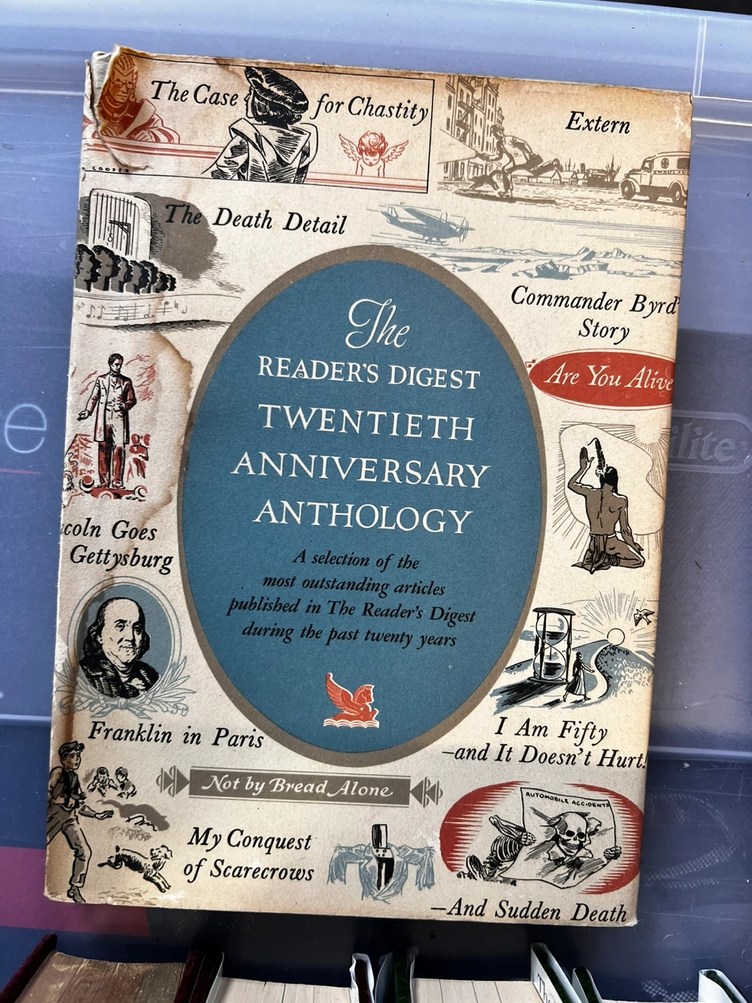 Selling a copy of The Reader's Digest Twentieth Anniversary Anthology. It's a selection of the most outstanding articles published in The Reader's Digest during the past twenty years. Some of the articles included are 'The Case for Chastity', 'The Death Detail', 'Commander Byrd Story', and 'I Am Fifty - and It Doesn't Hurt!'