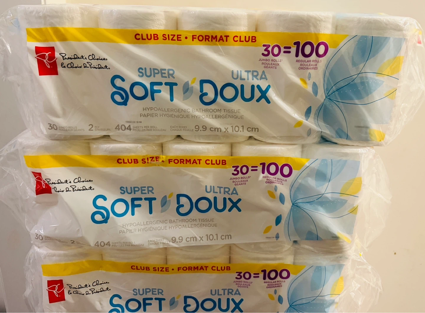 President's Choice Super Soft Ultra Doux hypoallergenic bathroom tissue. Each roll has 404 sheets. These are jumbo rolls measuring 9.9 cm x 10.1 cm.