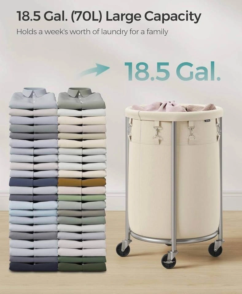 This heavy-duty round laundry basket features a strong steel frame, smooth-rolling wheels, and a removable fabric bag for easy cleaning and transport. Two locking wheels keep it securely in place when needed.