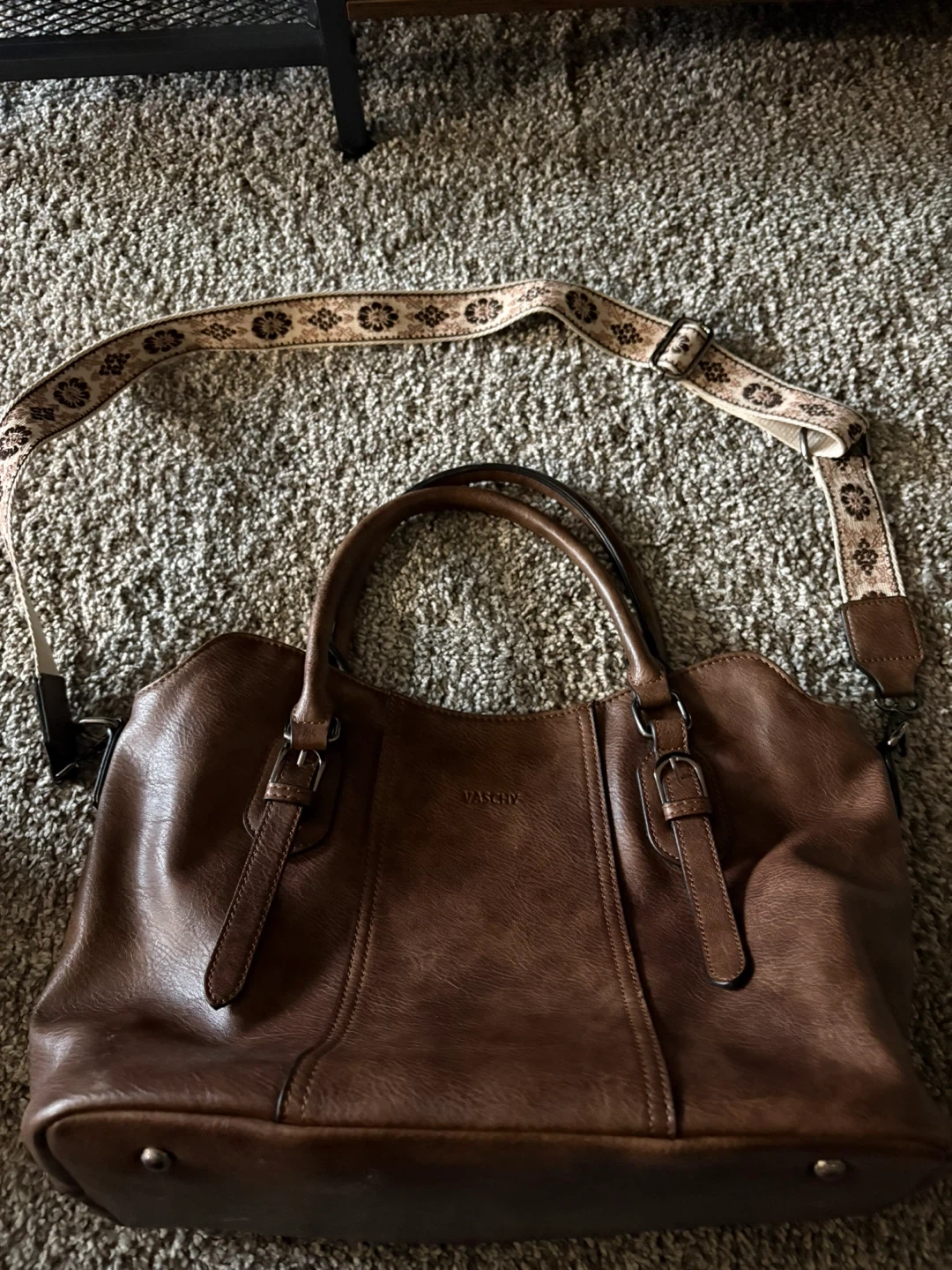 This VASCHY tote bag is made of brown leather. It features top handles and an adjustable crossbody strap with a floral pattern. It's a stylish and practical bag for everyday use!