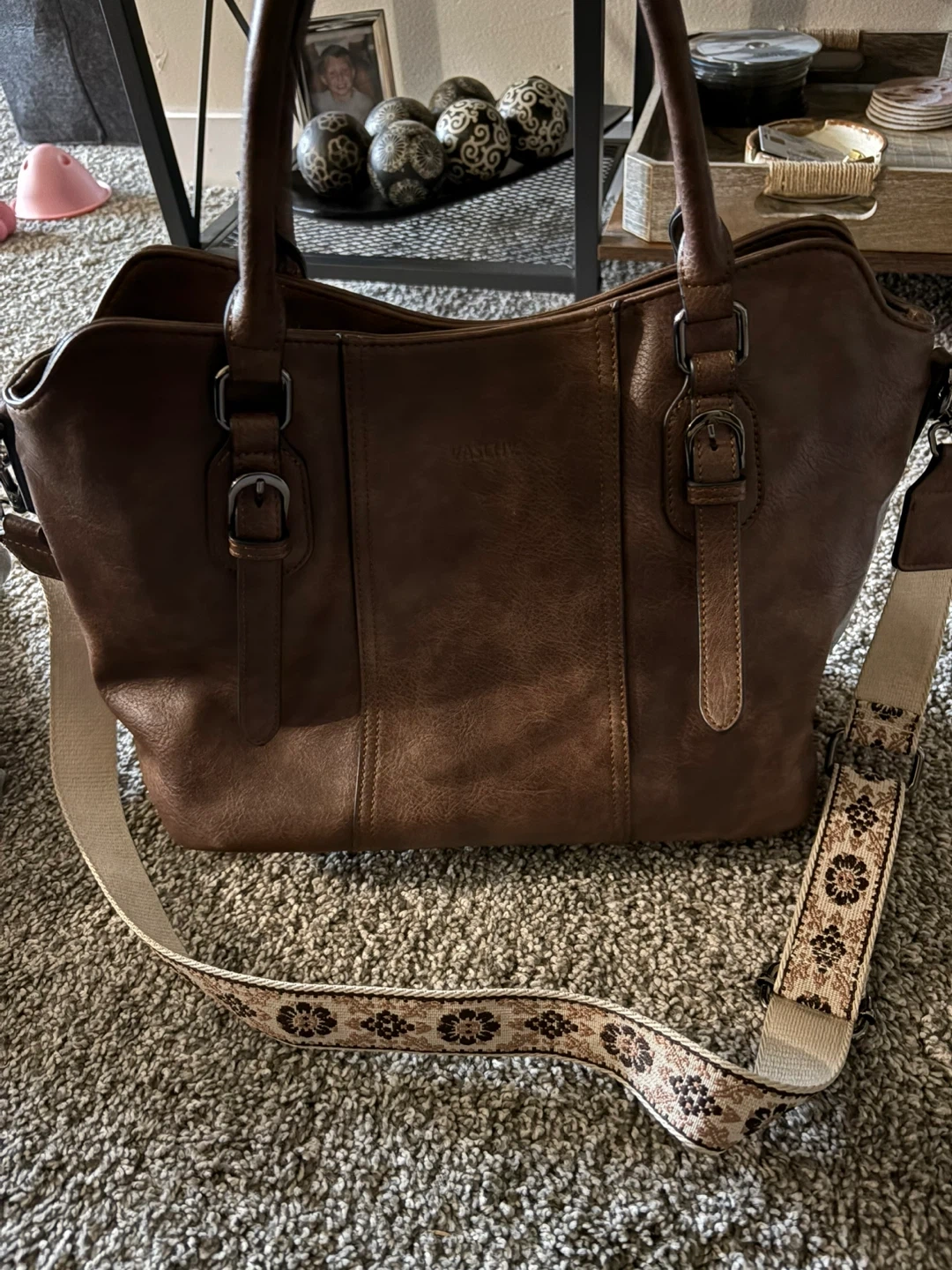 This VASCHY tote bag is made of brown leather. It features top handles and an adjustable crossbody strap with a floral pattern. It's a stylish and practical bag for everyday use!