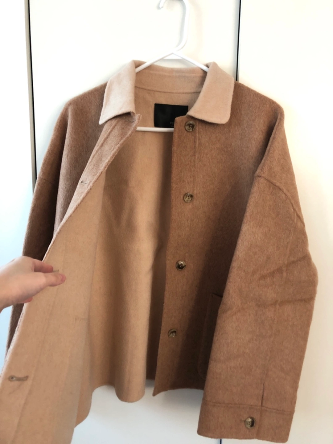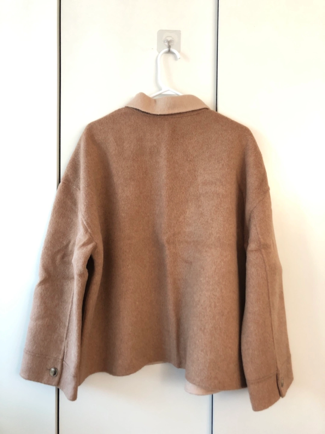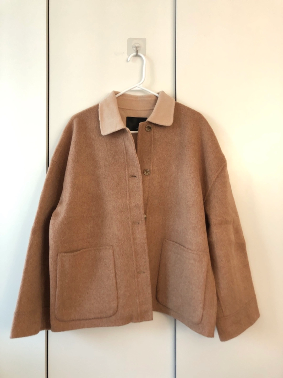 Brown wool blend jacket with a contrasting cream collar. Features button closure, patch pockets, and a relaxed fit.