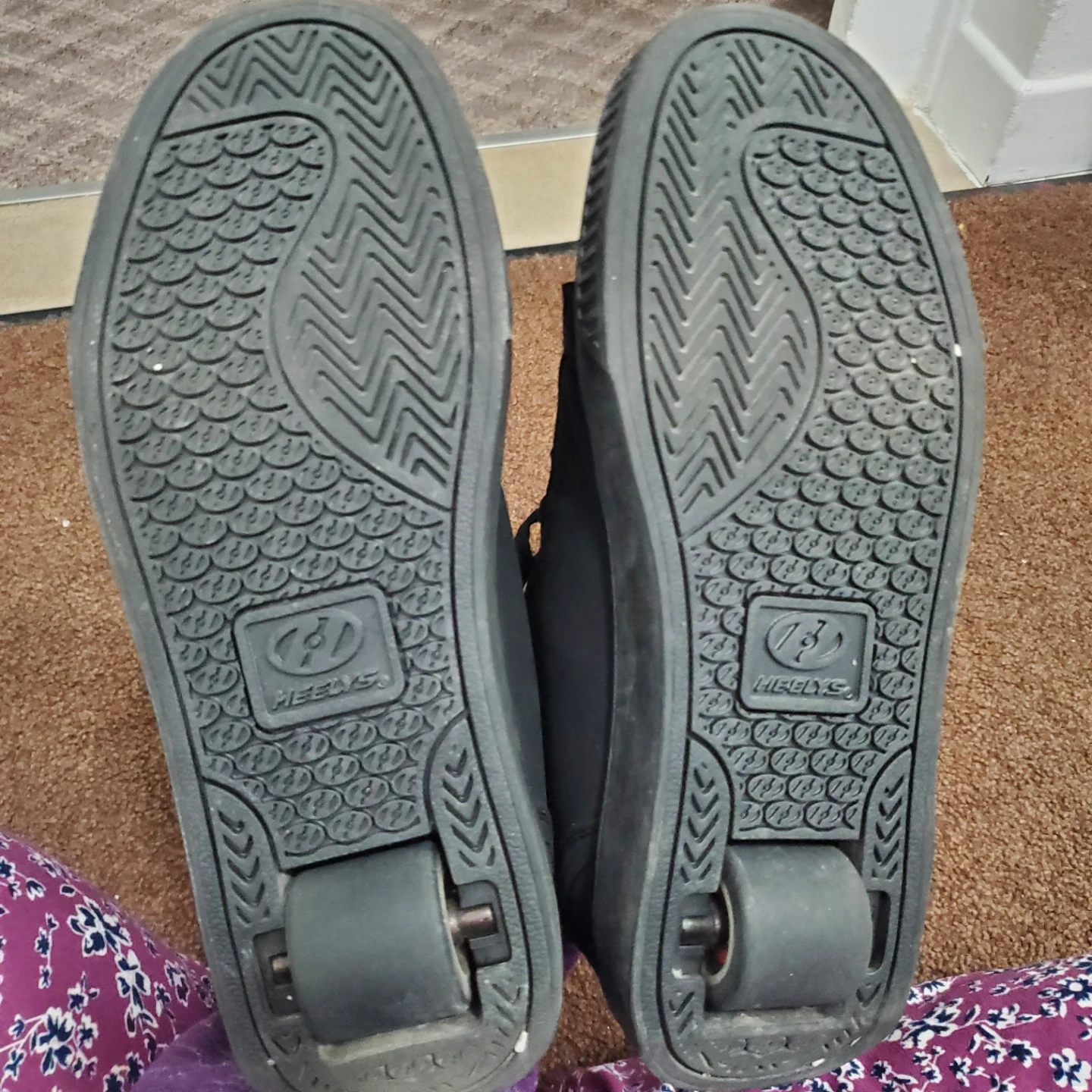Heelys black roller shoes with laces. These shoes have wheels on the bottom for rolling. They're great for cruising around! Size 8.