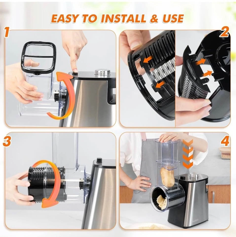 Anatole electric cheese grater with stainless steel construction. Includes 6 blades for shredding vegetables and cheese. Features a large inlet and outlet. BPA-Free, 110V. Feel free to message if you have any questions!