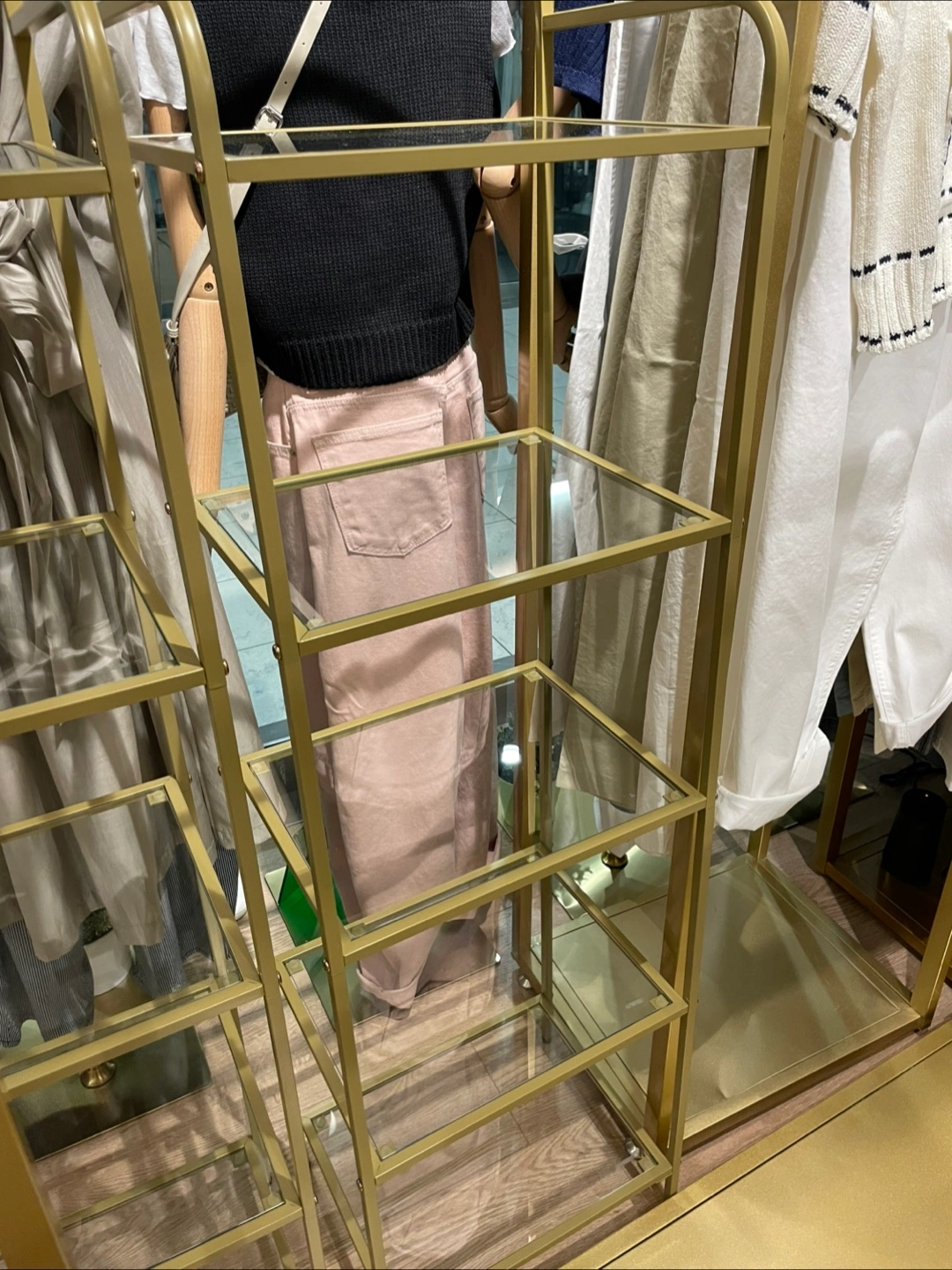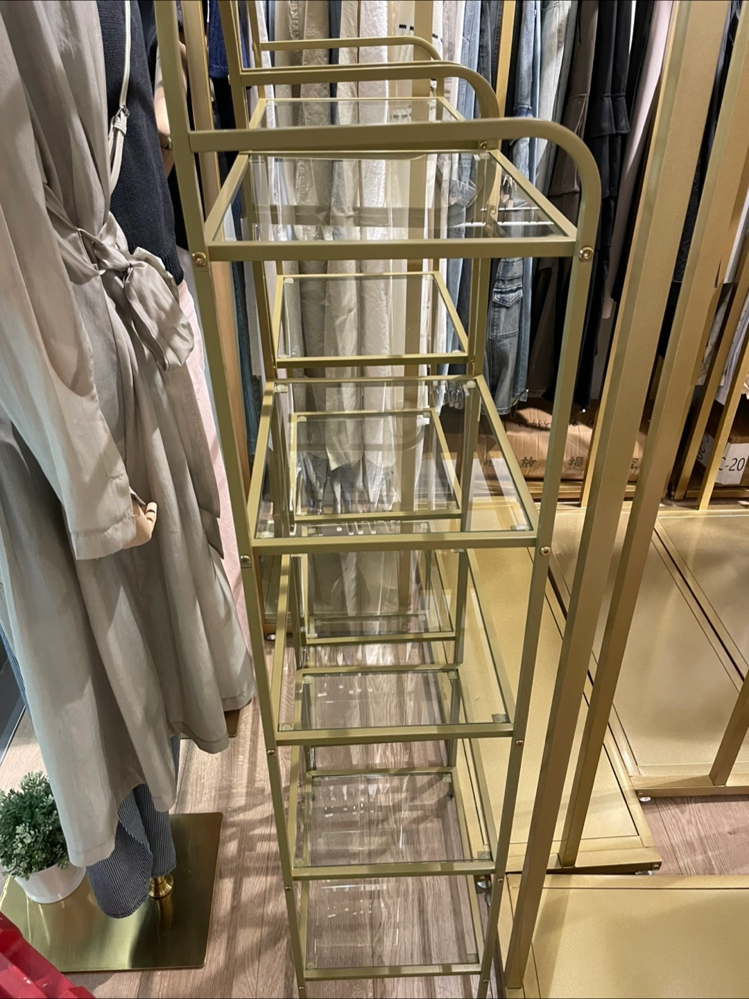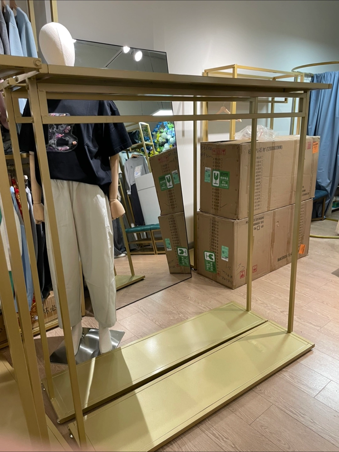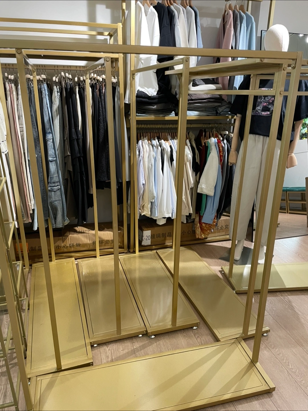 Here's a sturdy gold metal clothing rack, perfect for organizing your wardrobe or displaying items in a retail setting. It's in great shape and ready to use! It’s $100 each fixture or $600 take all