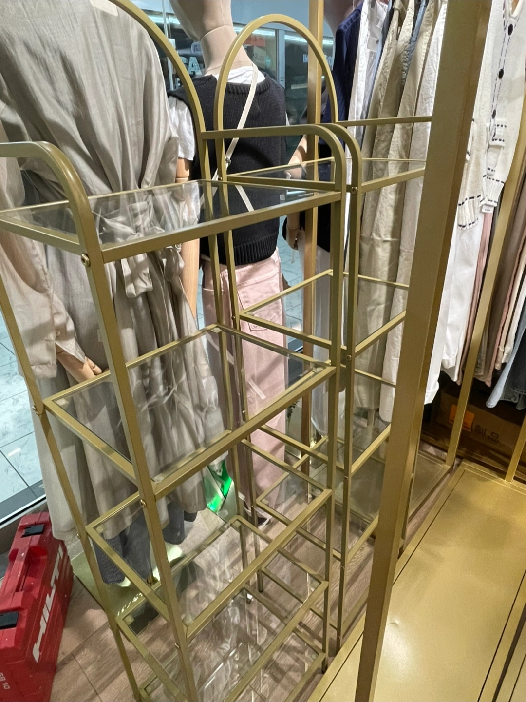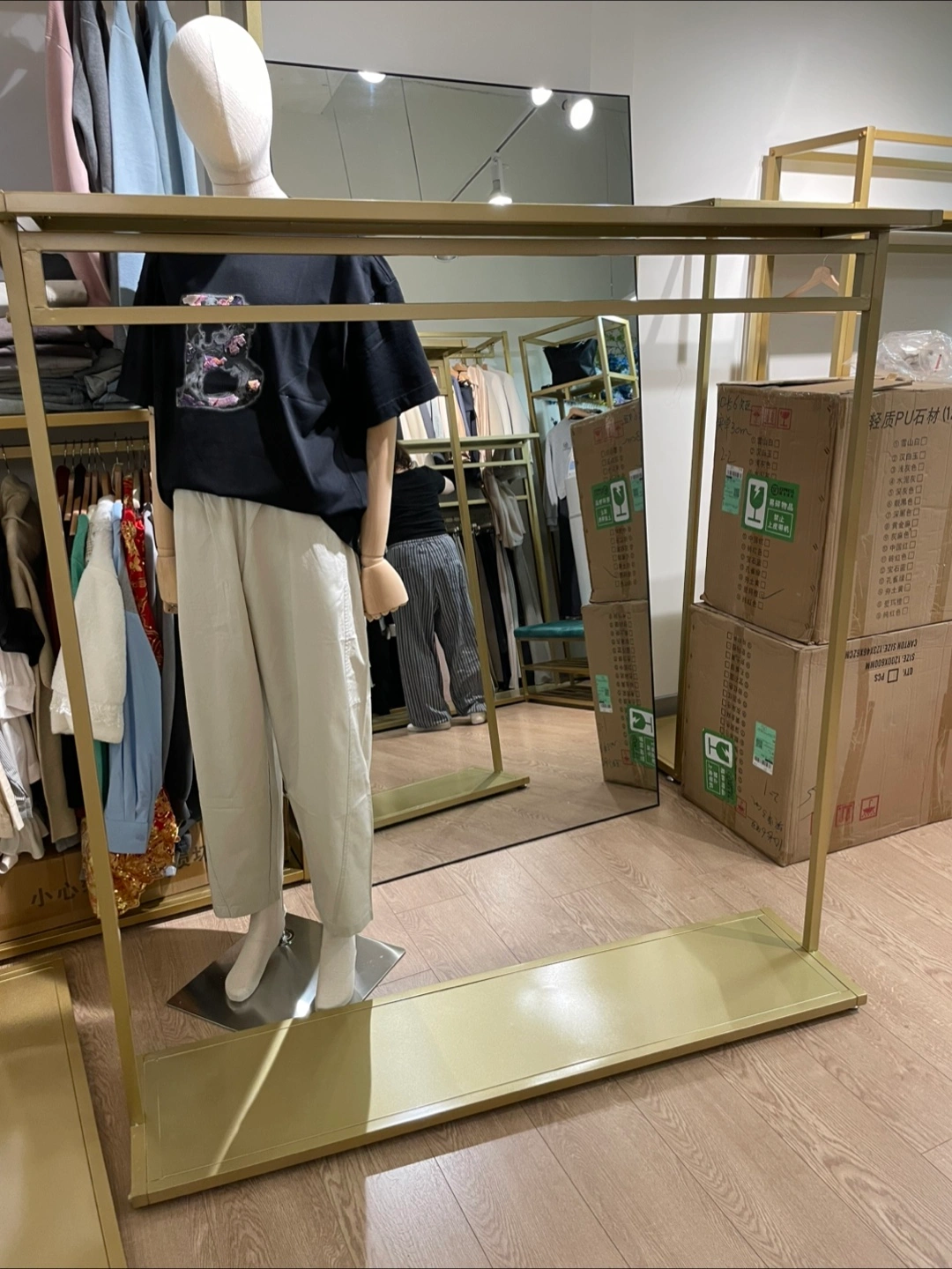 Here's a sturdy gold metal clothing rack, perfect for organizing your wardrobe or displaying items in a retail setting. It's in great shape and ready to use! It’s $100 each fixture or $600 take all