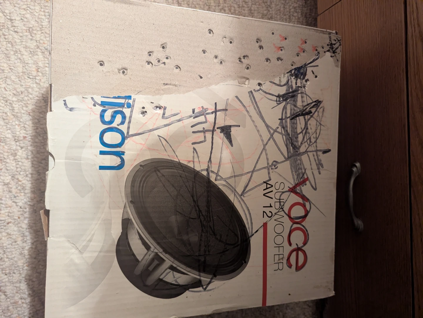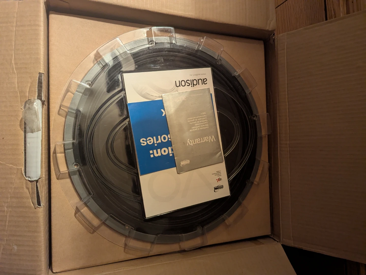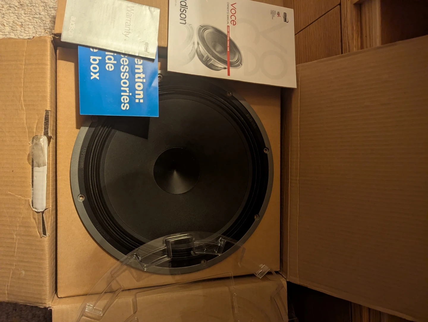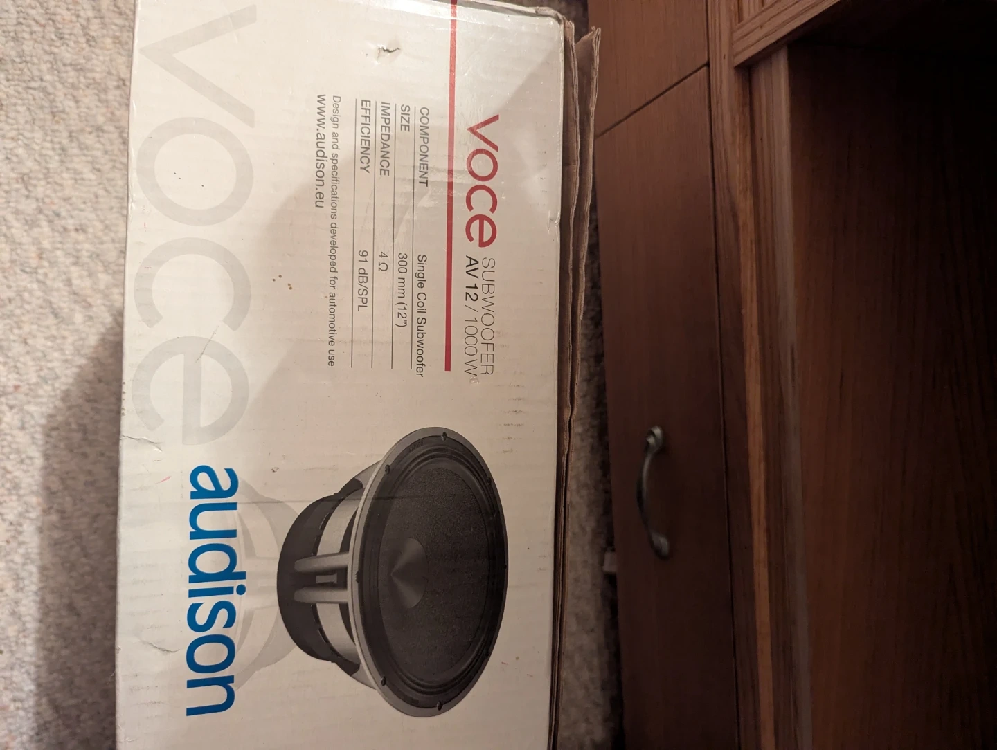 Audison Voce AV 12 subwoofer. It's a single coil subwoofer with a 12" size. Impedance is 4 ̆Ω. Efficiency is 91 dB/SPL. It includes original box and warranty information.