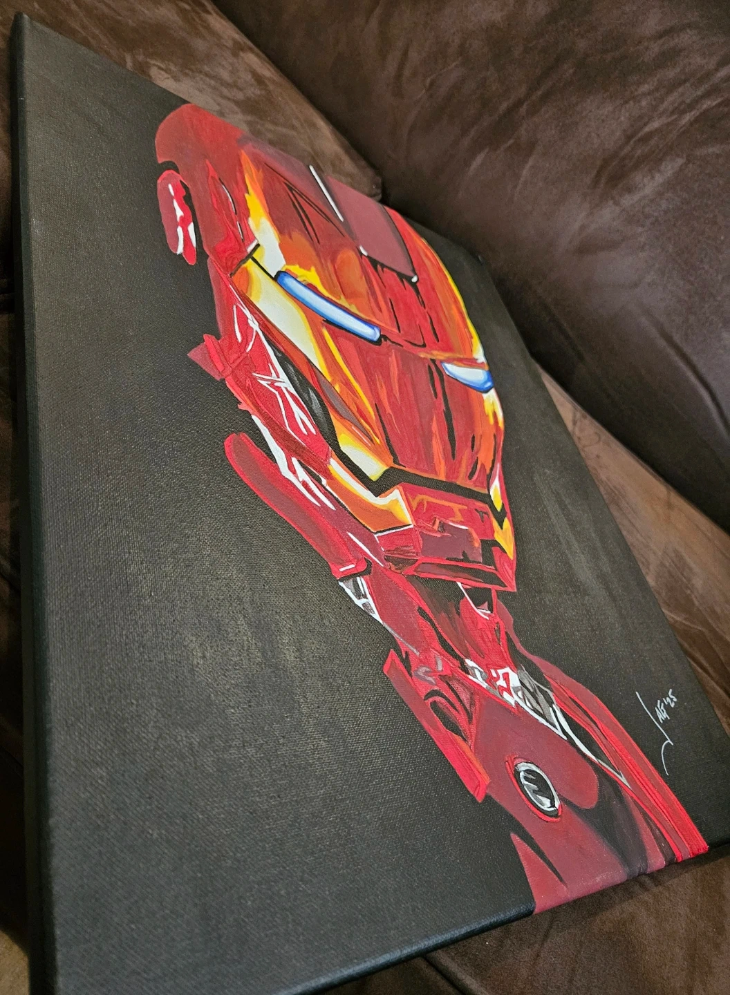 This is a canvas painting of Iron Man. It's hand-painted with vibrant colours. A great addition for any Marvel fan's collection! This is signed.