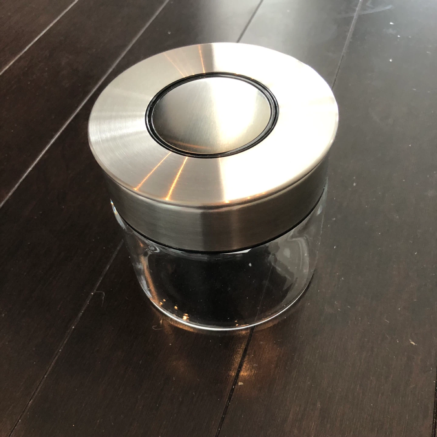 Selling a clear glass storage jar with a stainless steel lid. It's in new condition and perfect for storing dry goods in your pantry or kitchen. The lid fits securely to keep contents fresh and the clear glass allows you to easily see what's inside