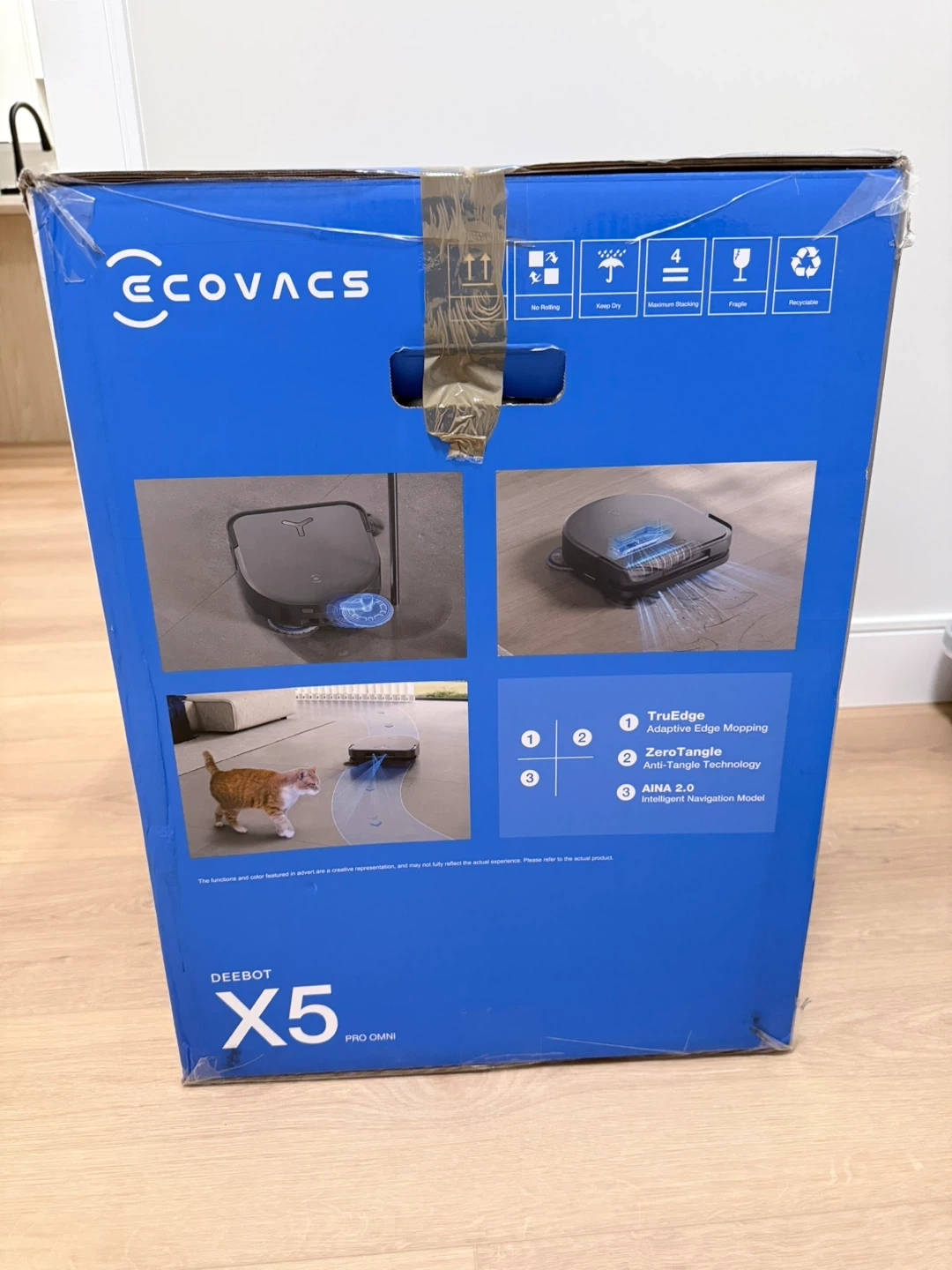 This is an ECOVACS DEEBOT X5 PRO OMNI robot vacuum. It features TruEdge Adaptive Edge Mopping and ZeroTangle Anti-Tangle Technology. It also has the AINA 2.0 Intelligent Navigation Model.
