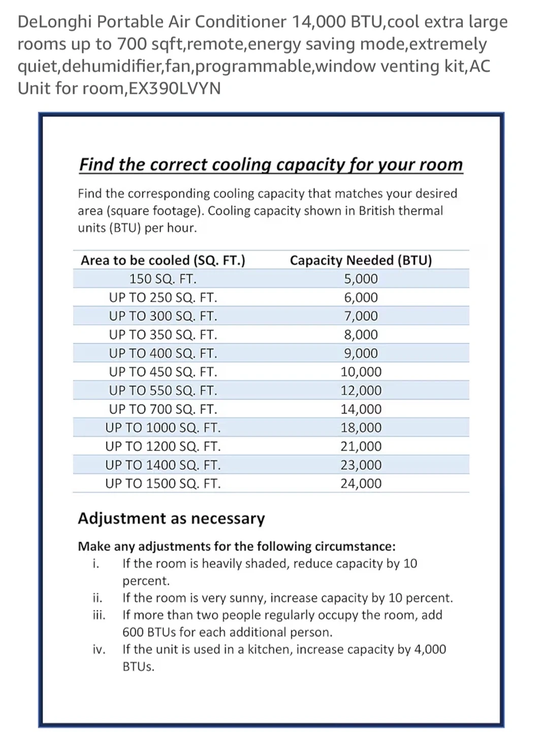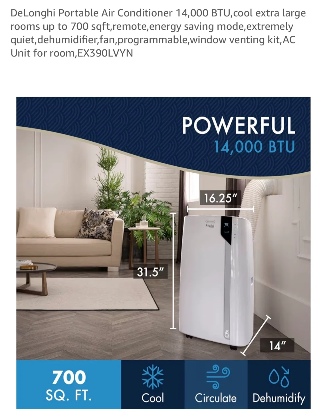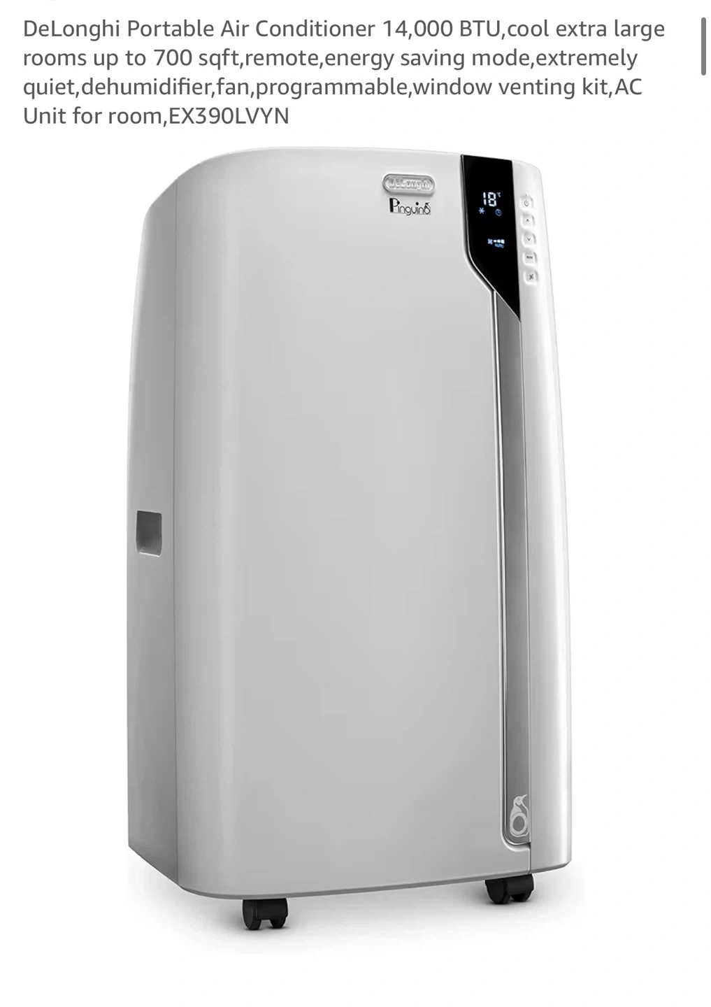This DeLonghi portable air conditioner offers 14,000 BTU cooling for rooms up to 700 sq. ft. It includes a remote, energy-saving mode, and operates extremely quietly. It also functions as a dehumidifier and fan, with a programmable timer and window venting kit included.