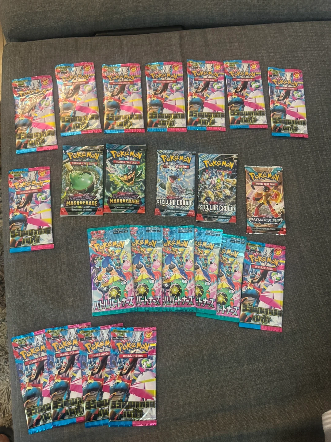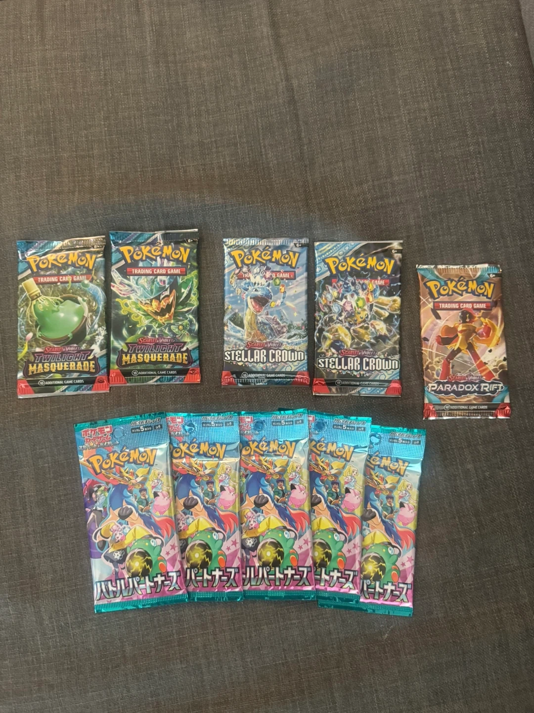 Here are 10 Pokemon TCG booster packs. Includes 2 Twilight Masquerade, 2 Stellar Crown, 1 Paradox Rift, and 5 Japanese Battle Partners packs. Plus 12 Thai mega evolution packs.