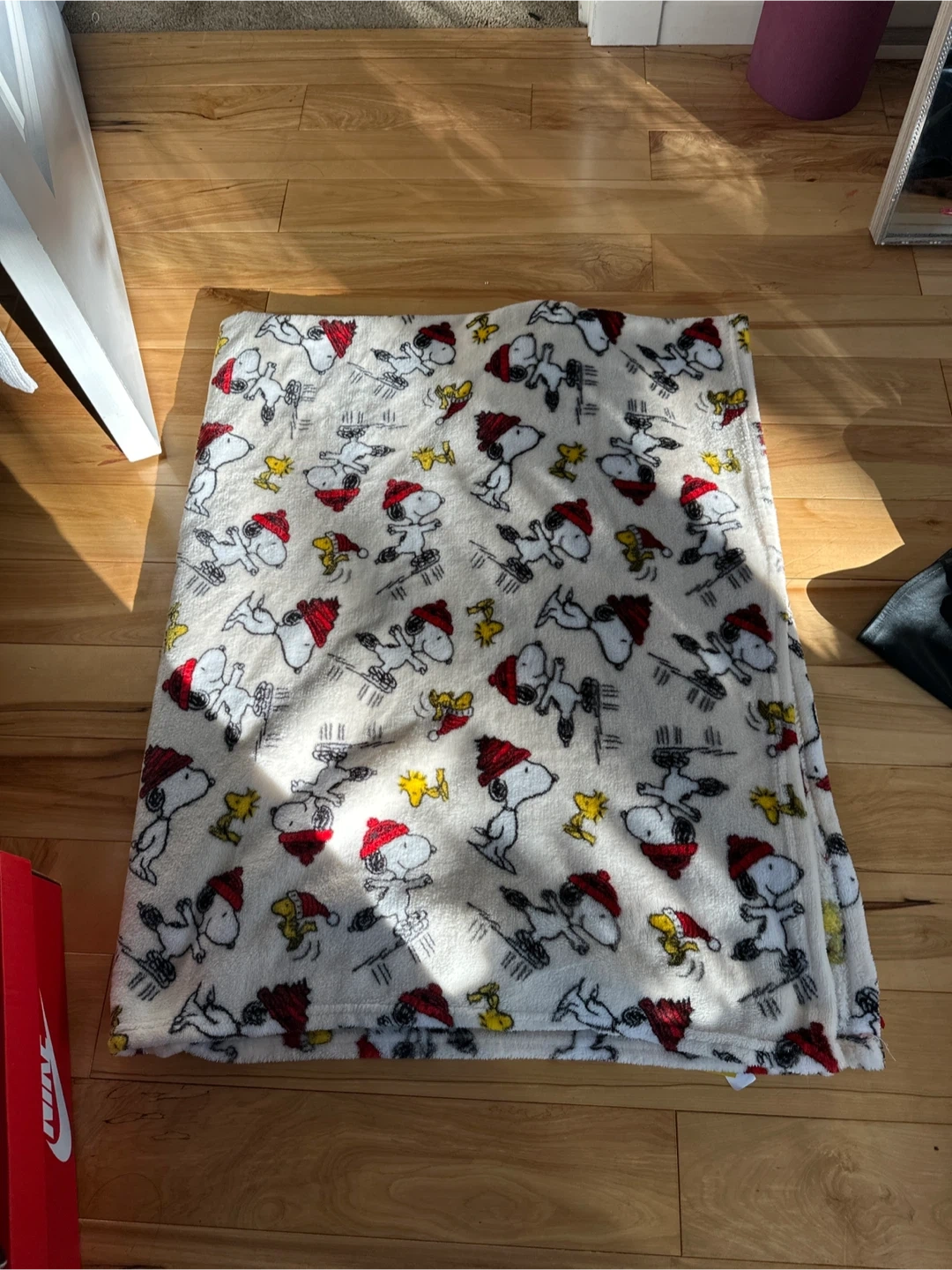 A cozy Peanuts throw blanket featuring Snoopy! It's in great condition and ready to keep you warm. The blanket is made of 100% polyester and has a fun, festive design.