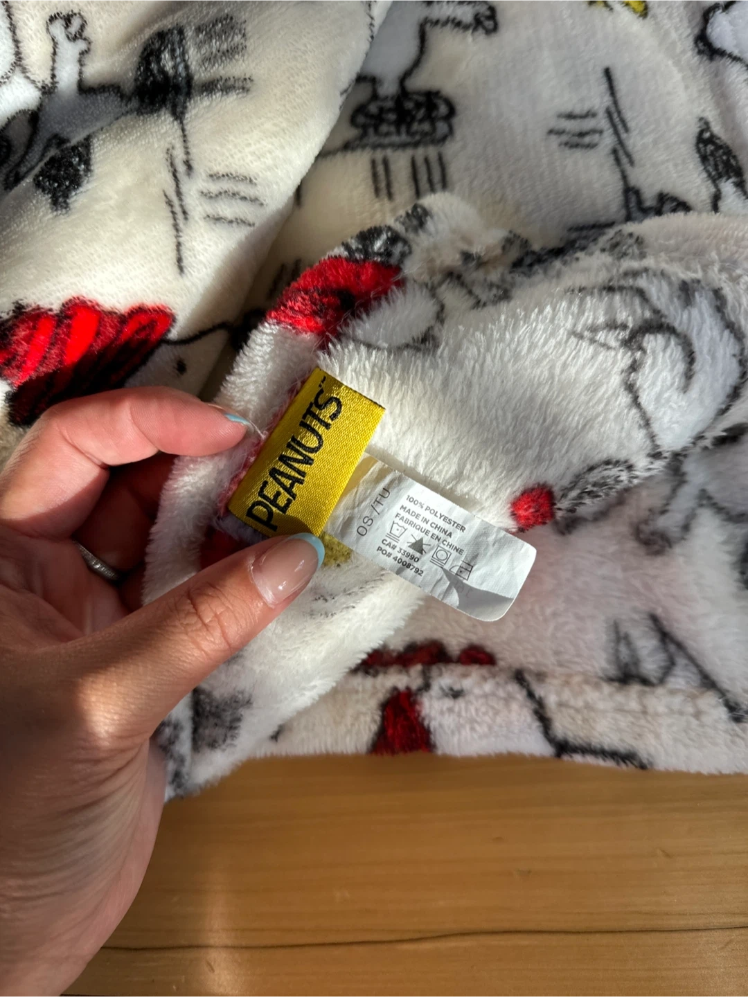 A cozy Peanuts throw blanket featuring Snoopy! It's in great condition and ready to keep you warm. The blanket is made of 100% polyester and has a fun, festive design.