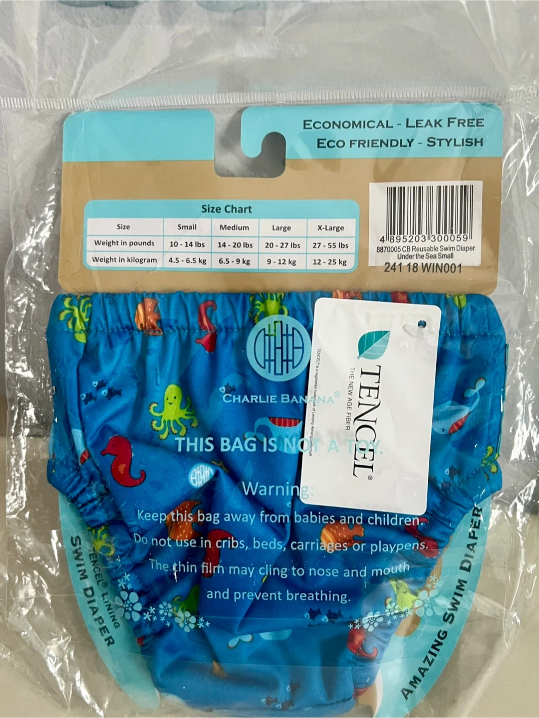 Keep your little one stylish and eco-friendly with this Charlie Banana reusable swim diaper! It's size small and features a fun under-the-sea design. Economical, leak-free, and ready for some splashy fun!