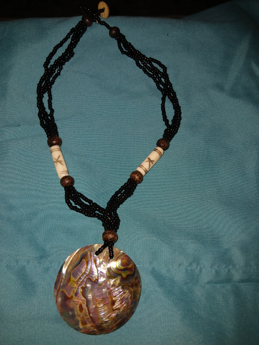 Beautiful beaded necklace with an abalone shell pendant. The necklace features black beads, wooden accents, and bone-like beads with star designs. It's a unique piece that adds a touch of natural elegance to any outfit!