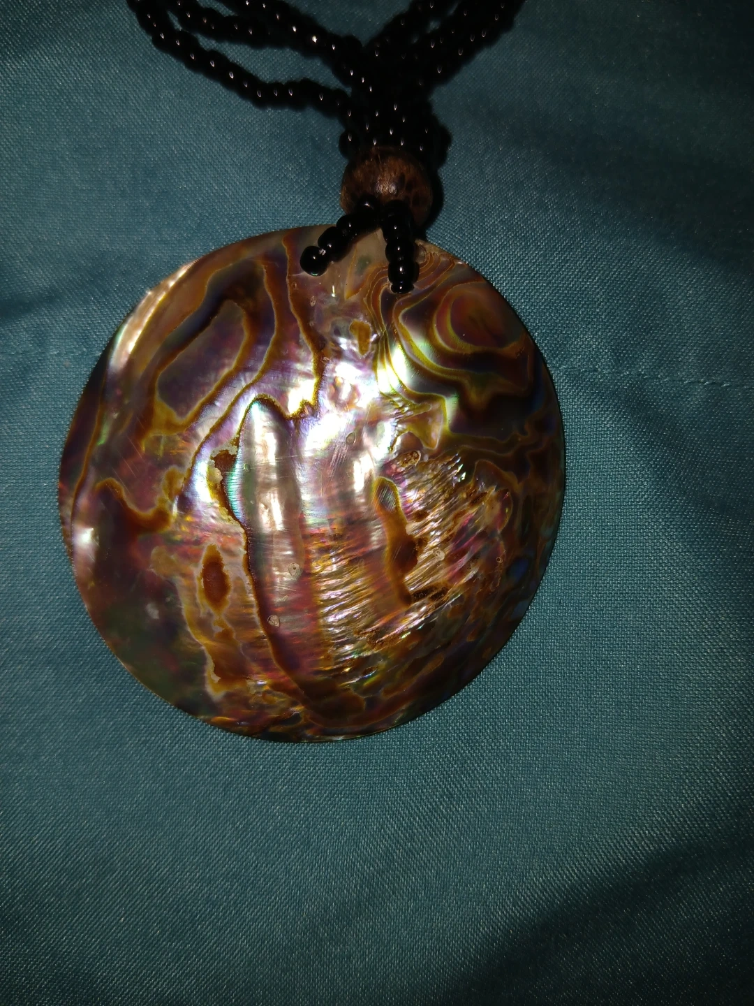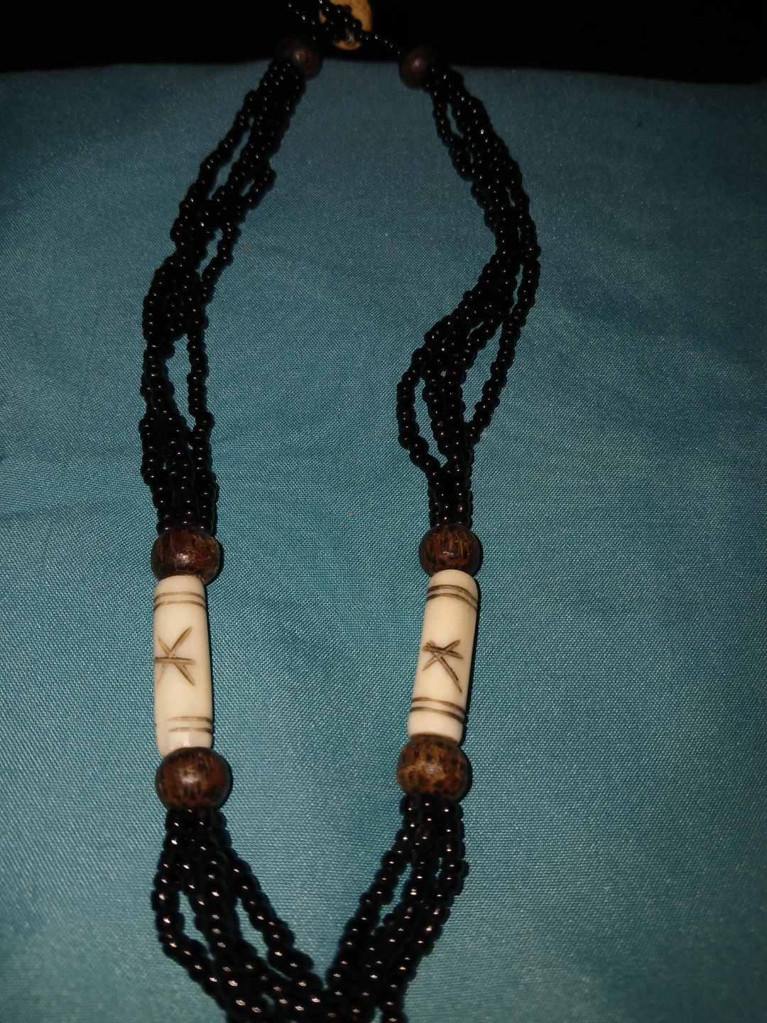 Beautiful beaded necklace with an abalone shell pendant. The necklace features black beads, wooden accents, and bone-like beads with star designs. It's a unique piece that adds a touch of natural elegance to any outfit!