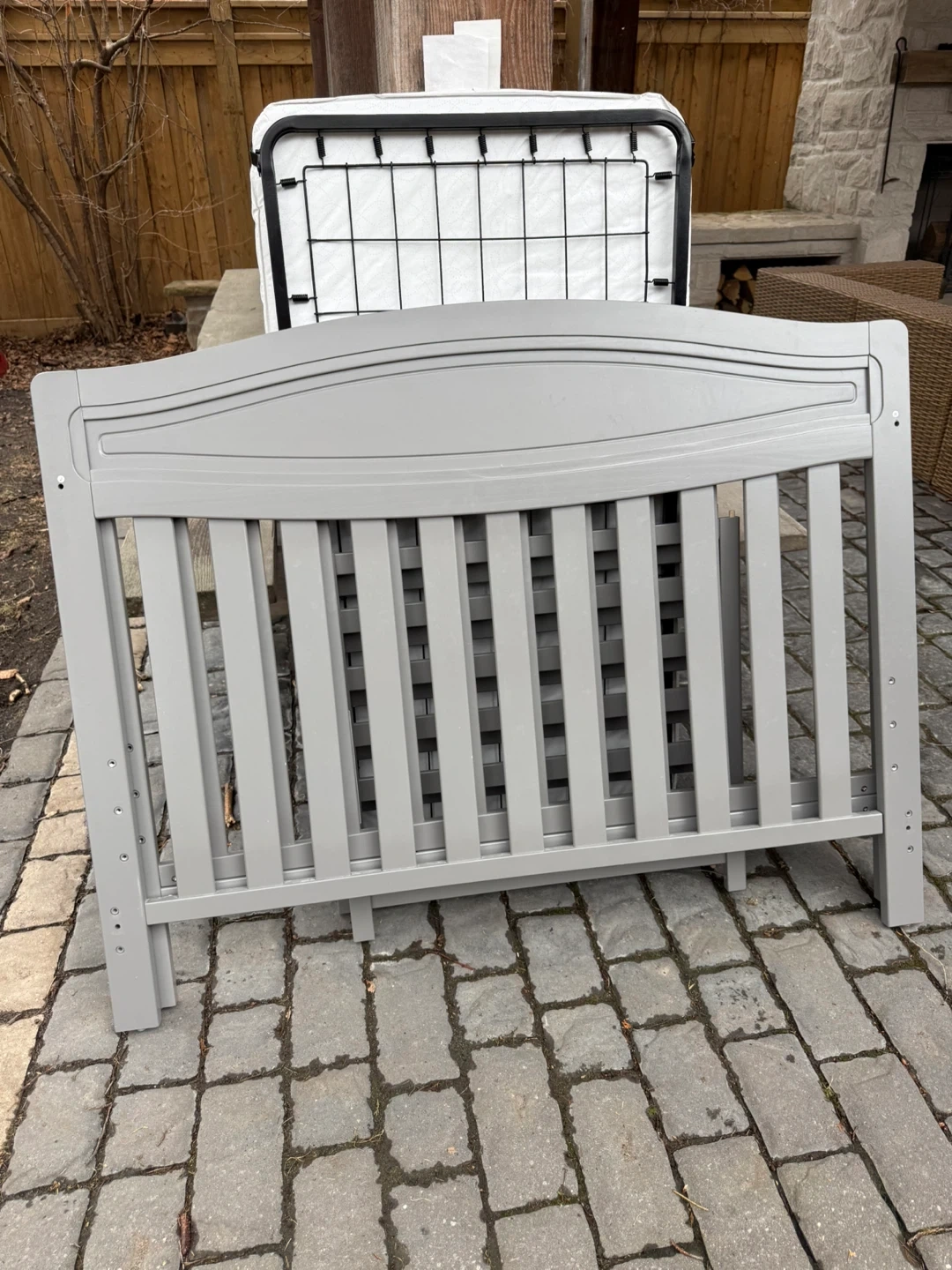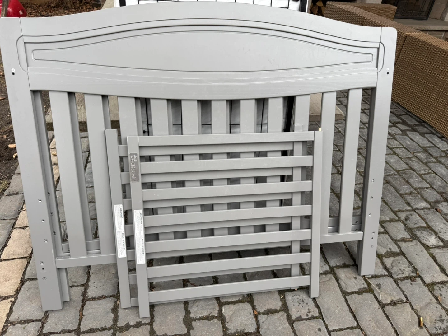 This is a classic Child Craft grey baby crib with a mattress. It has a classic design and also comes with new in box conversion kit to turn into a single bed for when they are older. In great condition and already dismantled and ready for new owner!