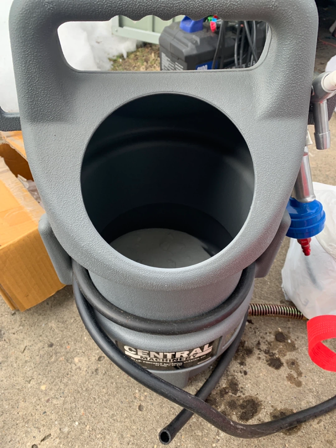 This Central Pneumatic portable abrasive blaster kit is gray. It's designed for various blasting tasks. Includes hoses and accessories.