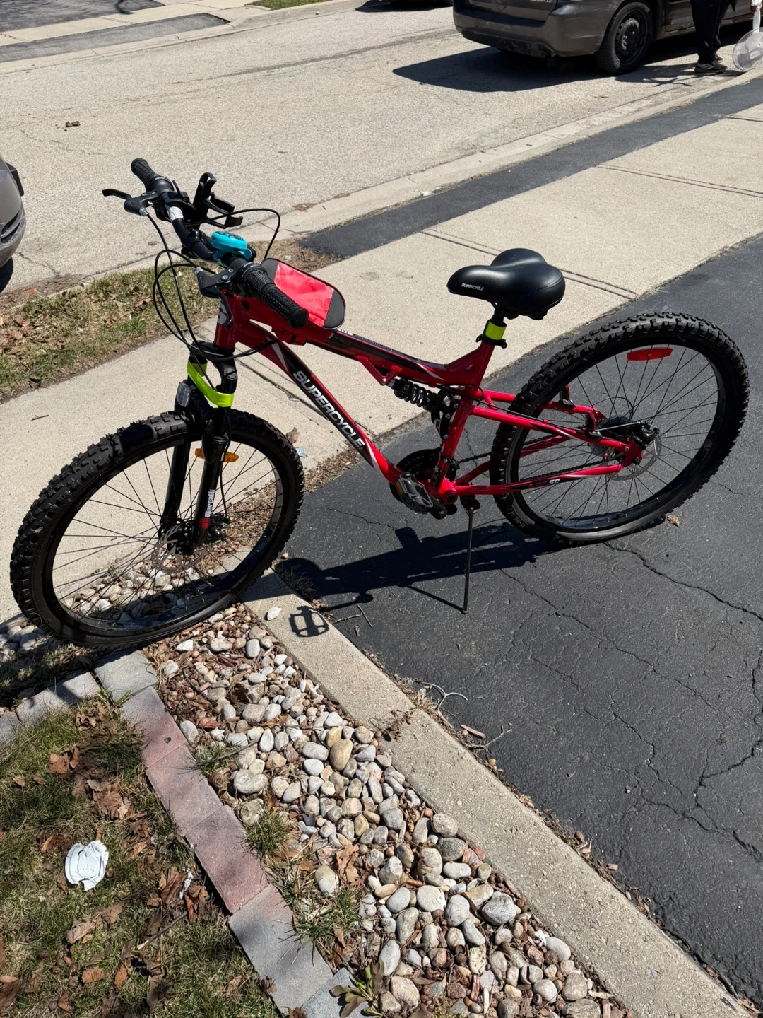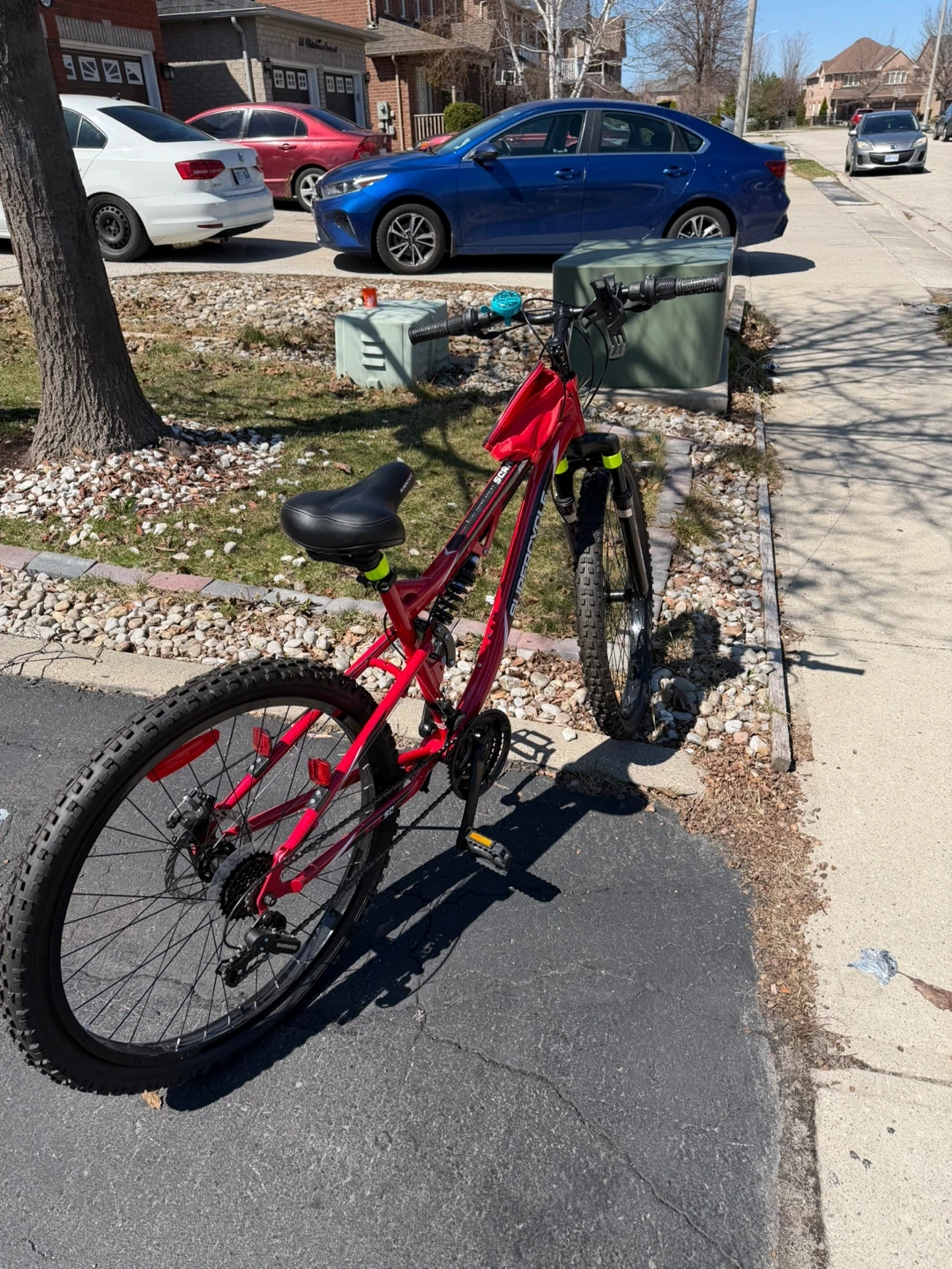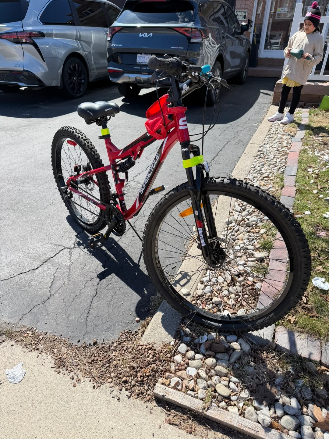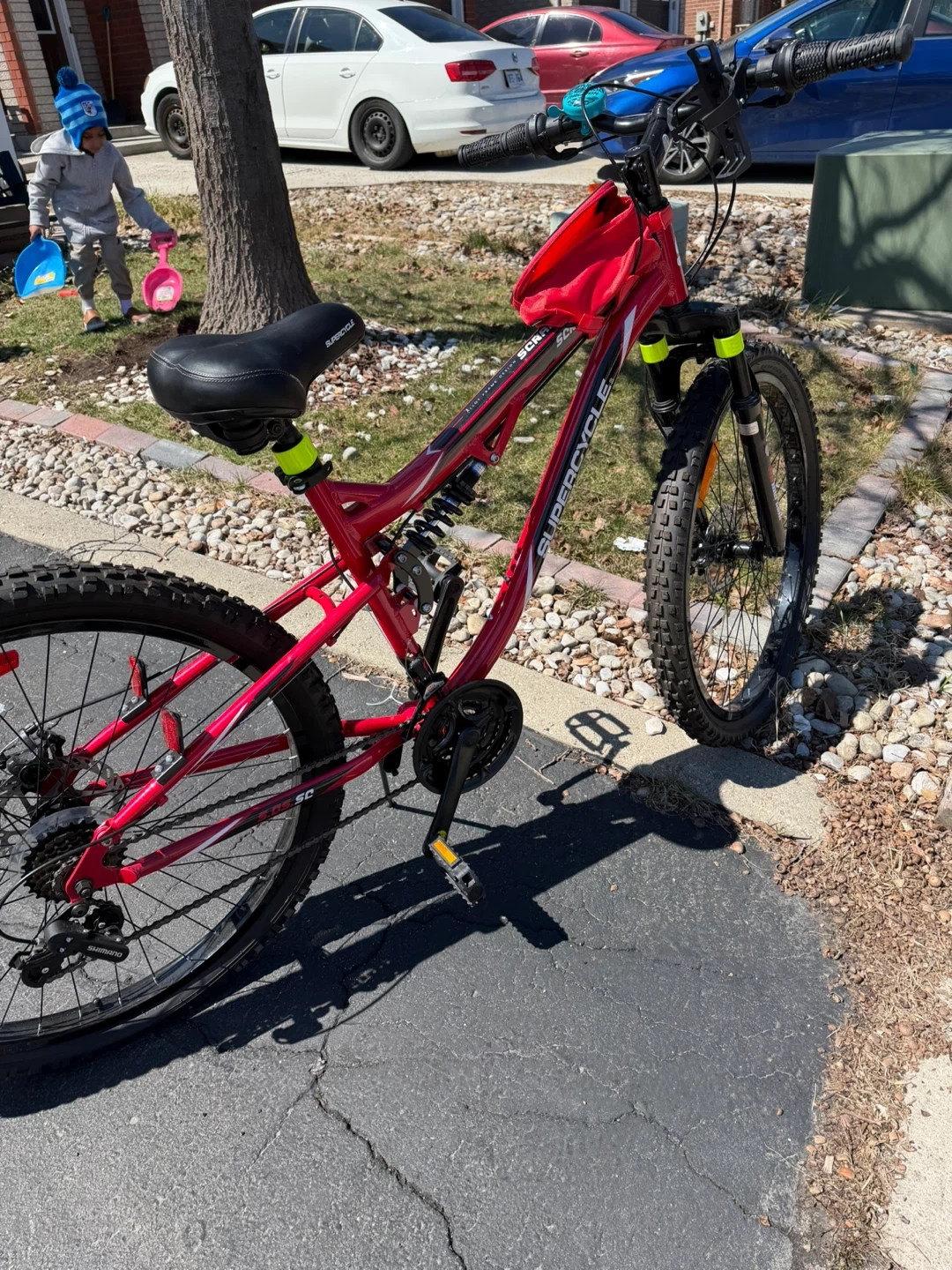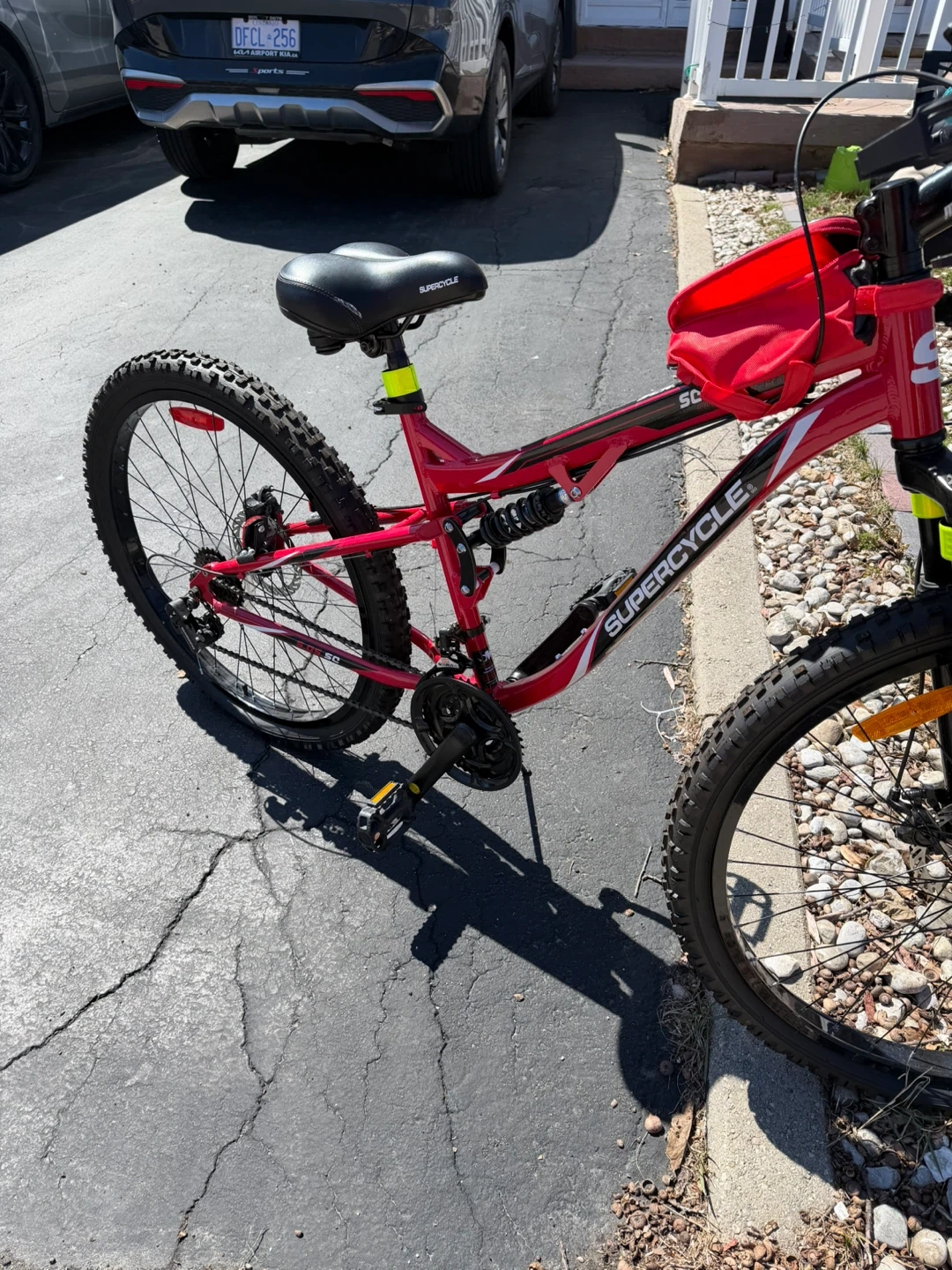 Red Supercycle full suspension mountain bike. Features front and rear suspension. Includes a saddle bag and front light.