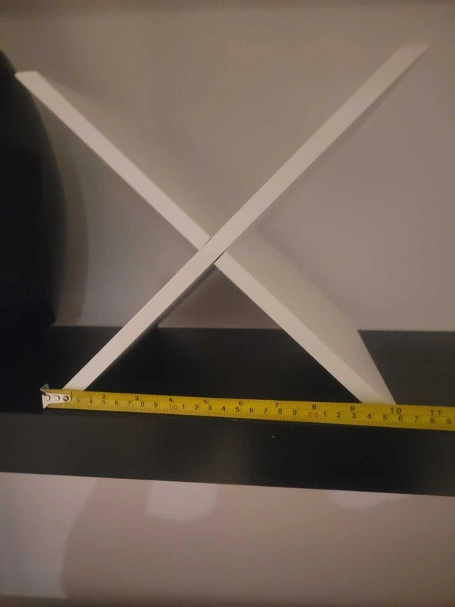This is a used white, intersecting shelf, perfect for adding a modern touch to any room while providing practical storage. Measuring approximately 11 inches in height and width, this compact shelf is ideal for small spaces. Structurally sound, it presents a stylish solution for organizing your favourite items. Colour: White, Material: Wood, Dimensions: 11" x 11". This chic shelf is ready to find a new home and add a bit of flair to your space. If you're eyeing this ad, rest assured, the shelf is still available for grabs! Cash accepted.