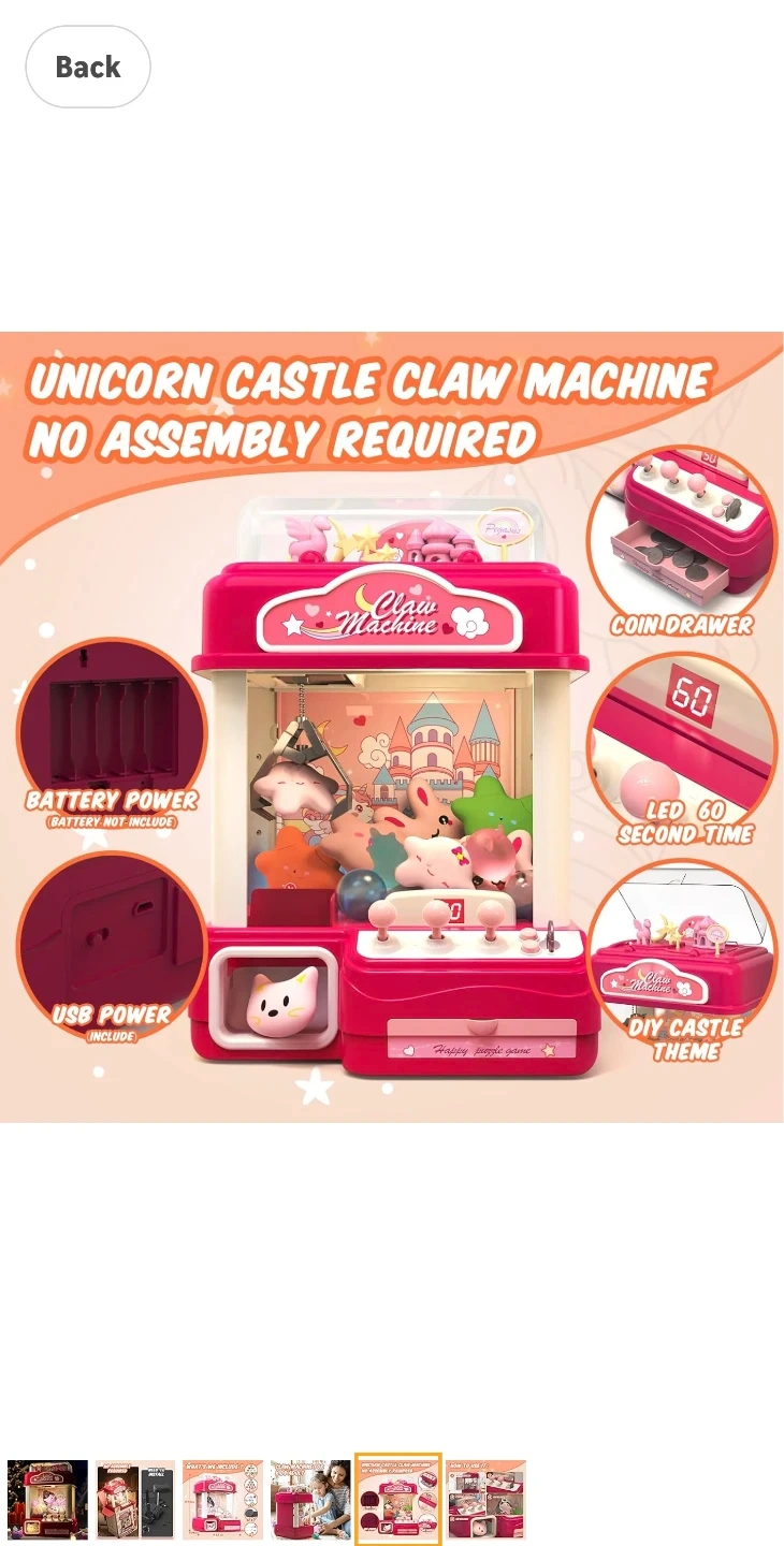 【Fun Unicorn Castle Claw Machines Toys】The dimensions of our large claws machine are 15.35 inches in length, 10.04 inches in width, and 11.02 inches in height. 5 x "AA" batteries are needed to operate it, but they are not included. Additionally, the USB cable that comes with it can also be used for continuous playing enjoyment. Inside the box, you will find 10 twisted eggs, 10 dolls, 7 soft pinch toys, and 25 coins. This toys for age 8-13.