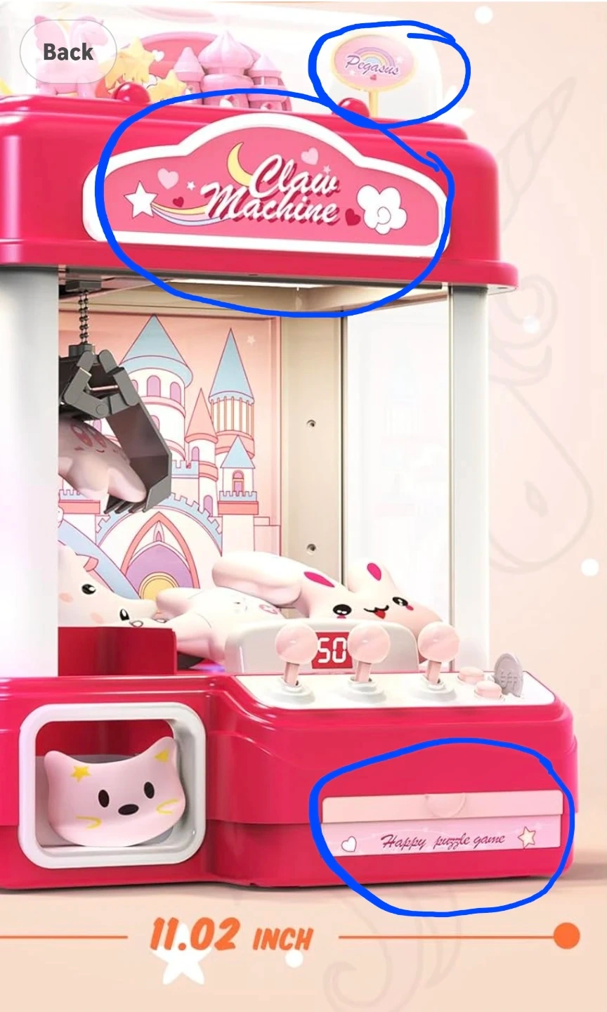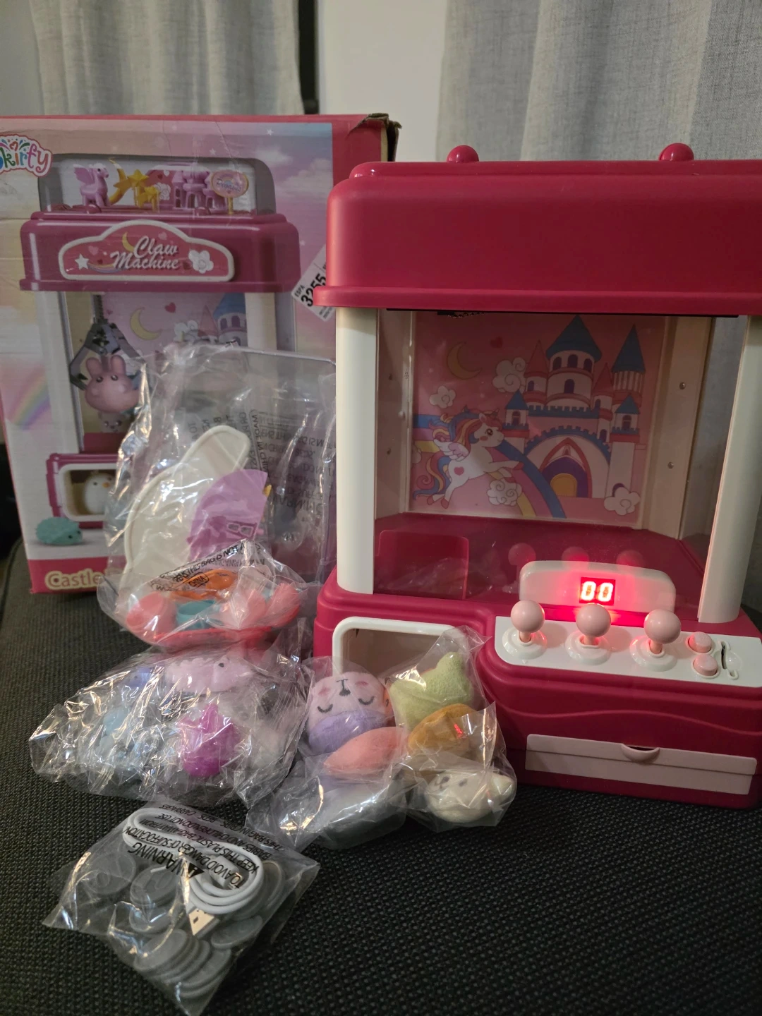 【Fun Unicorn Castle Claw Machines Toys】The dimensions of our large claws machine are 15.35 inches in length, 10.04 inches in width, and 11.02 inches in height. 5 x "AA" batteries are needed to operate it, but they are not included. Additionally, the USB cable that comes with it can also be used for continuous playing enjoyment. Inside the box, you will find 10 twisted eggs, 10 dolls, 7 soft pinch toys, and 25 coins. This toys for age 8-13.
