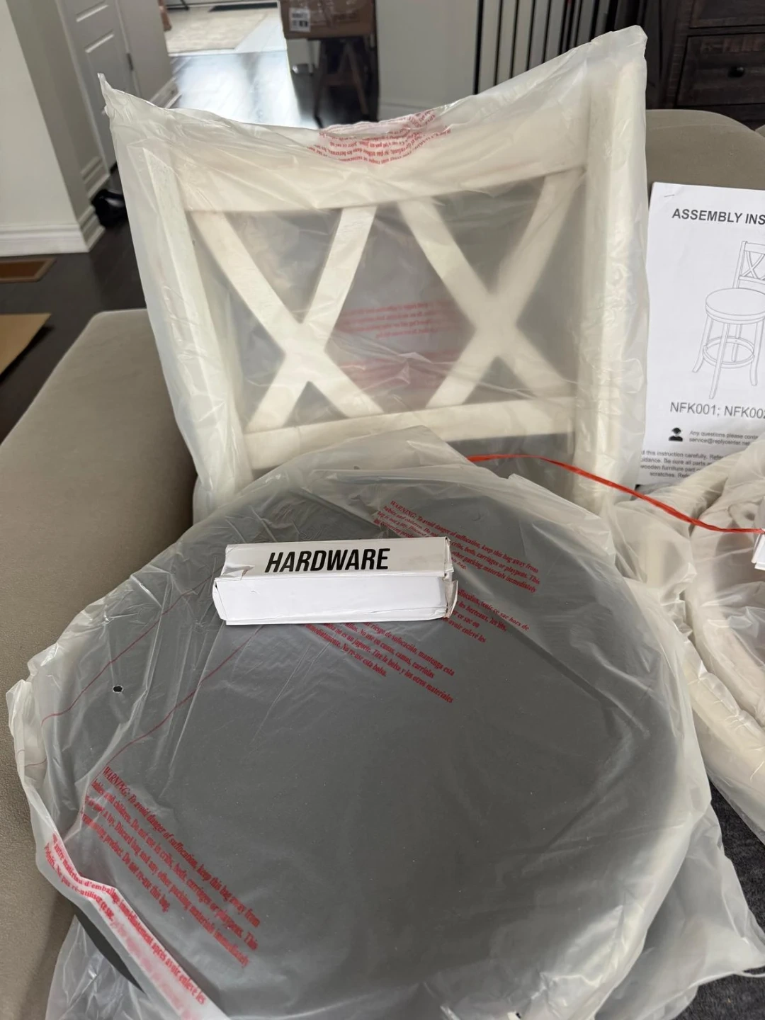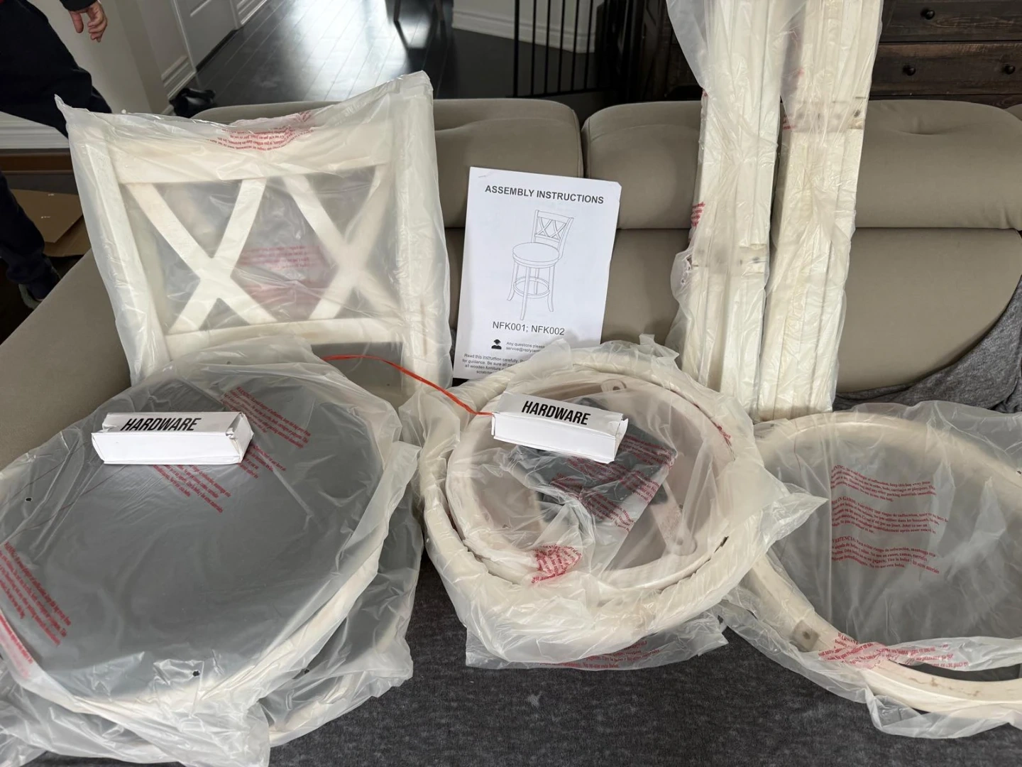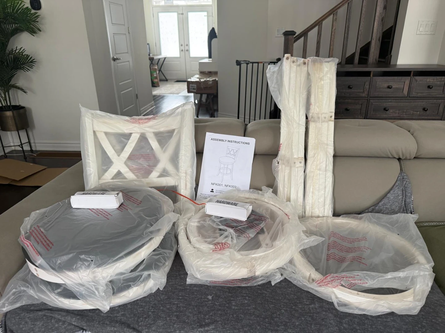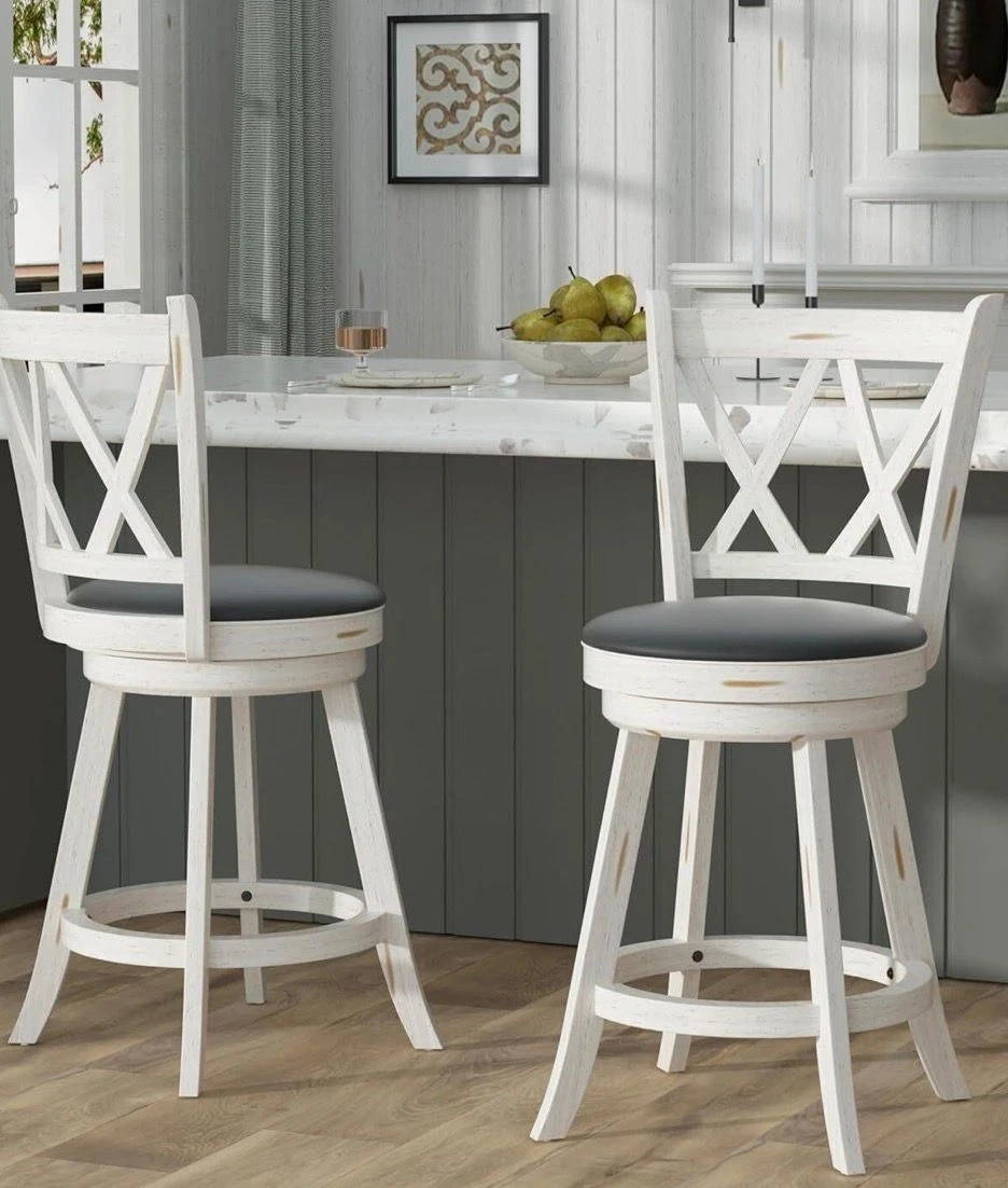 Brand new Set of two white bar stools with a distressed finish and cross-back design. Includes assembly instructions and hardware. These stools offer a stylish and practical seating solution for your kitchen island or home bar.