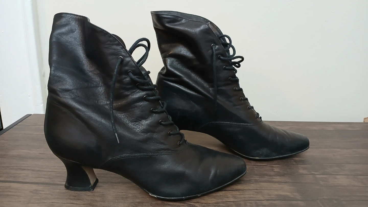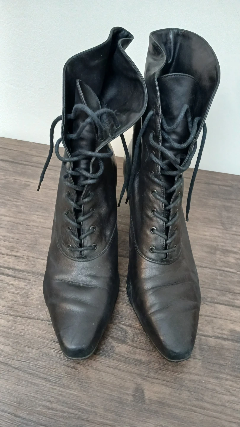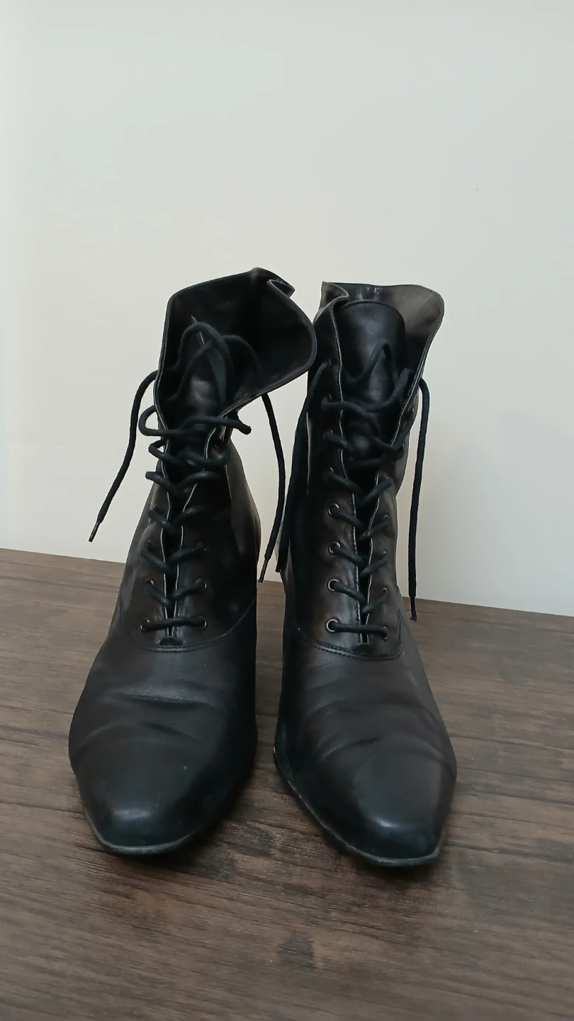 Selling a pair of black leather lace-up ankle boots. They have a classic and stylish look with a comfortable heel height. These boots are perfect for adding a touch of elegance to any outfit. They show some signs of wear but are still in good condition for everyday use!