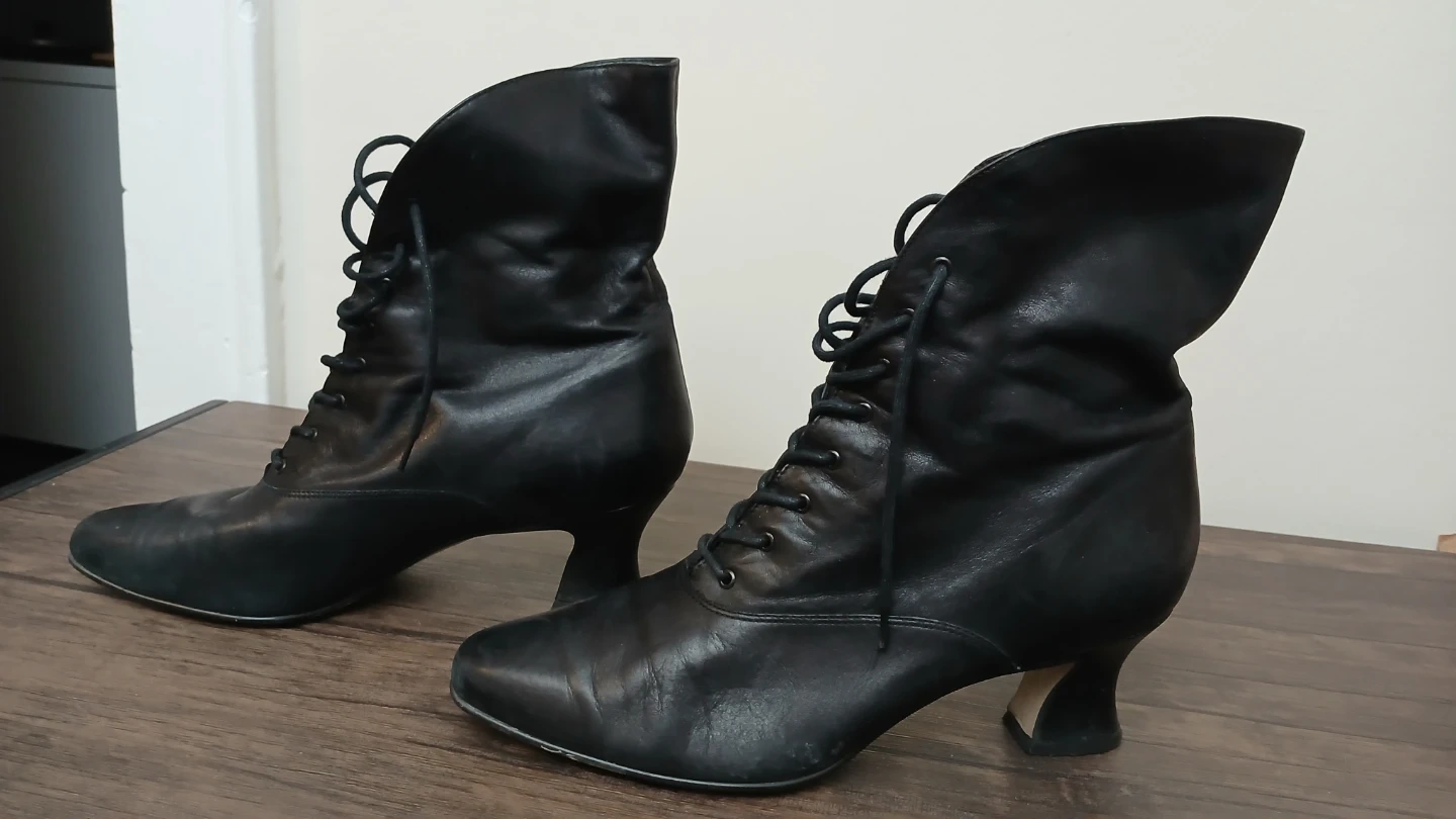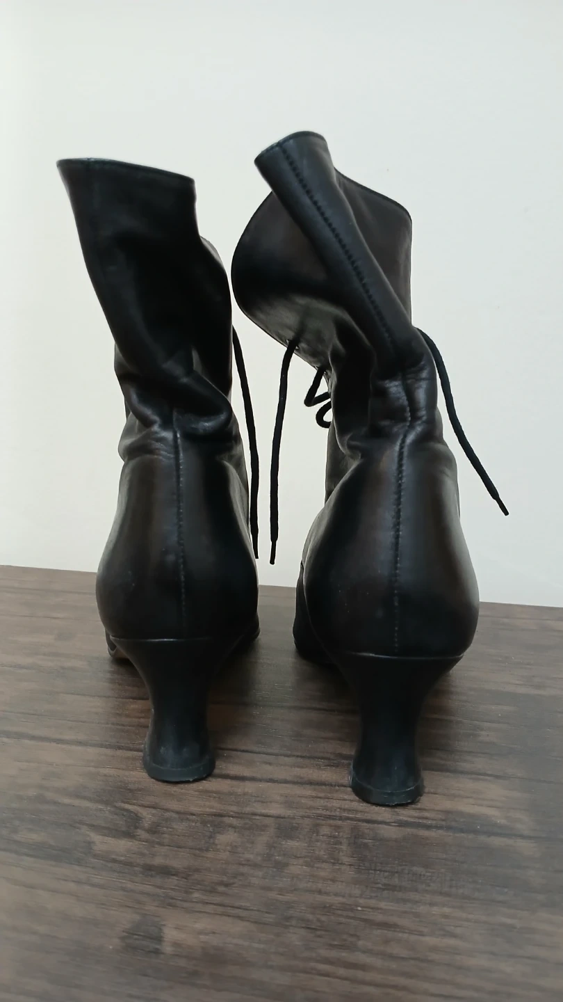 Selling a pair of black leather lace-up ankle boots. They have a classic and stylish look with a comfortable heel height. These boots are perfect for adding a touch of elegance to any outfit. They show some signs of wear but are still in good condition for everyday use!