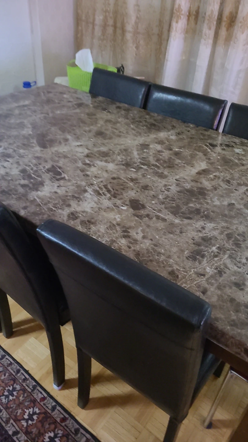 Dining table with a marble-look top. It has a smooth, polished surface. Seats six comfortably.It has small craches but not seen. It's In very good condition. It was bought from bricks. I purchased a new dinning table and want it go by Monday.