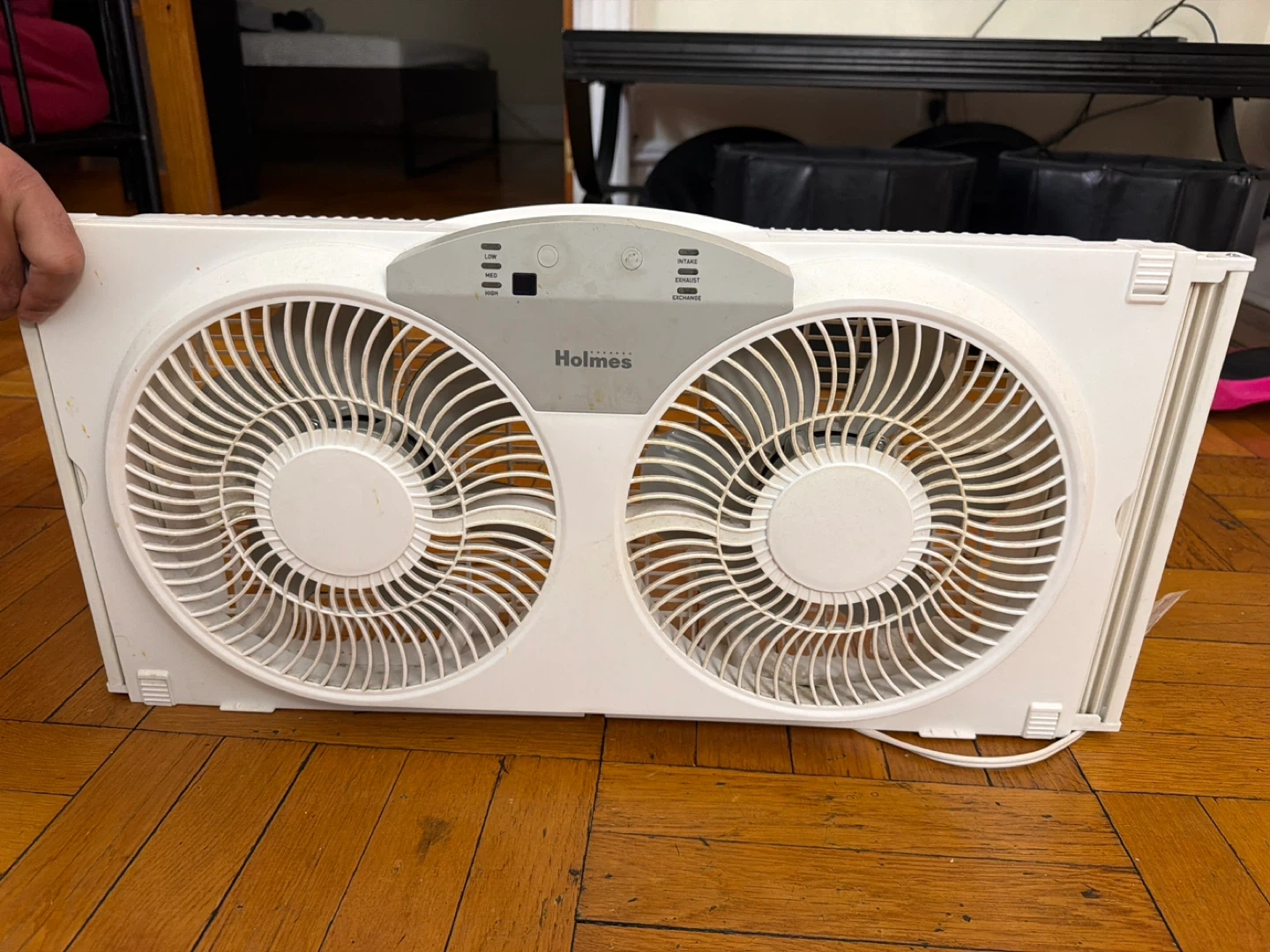 Holmes dual blade window fan. Features three speed settings for low, medium, and high airflow. The blades are designed for both intake and exhaust airflow. Great for cooling your room!