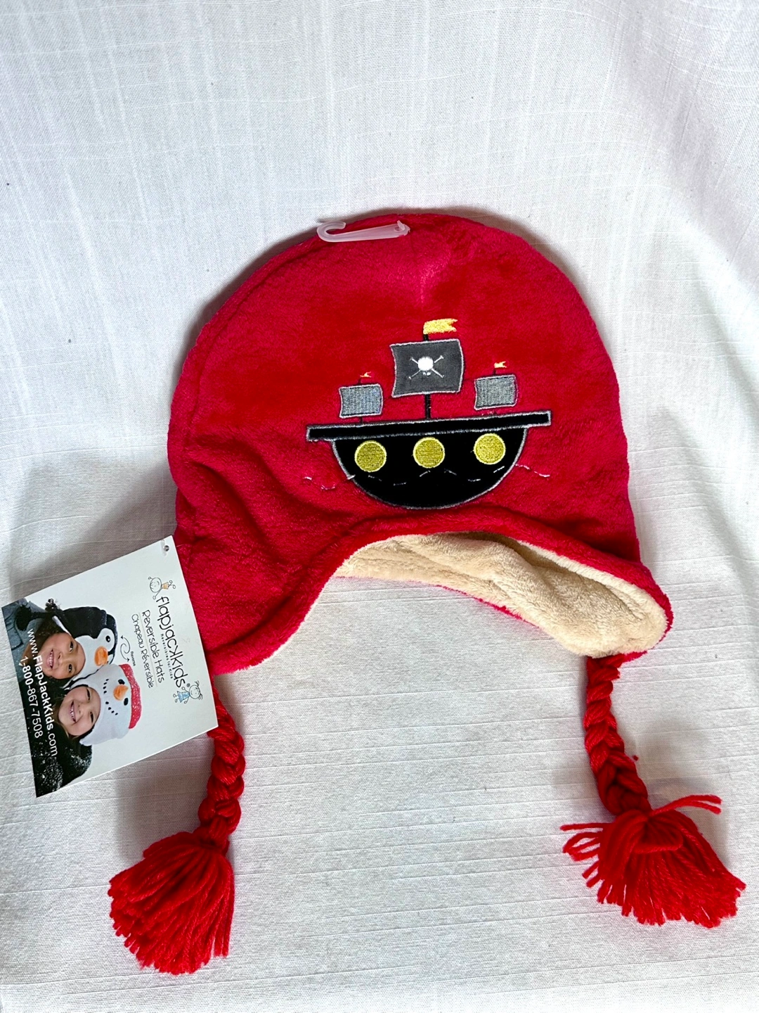 Adorable reversible fleece hat. Features a pirate ship design on one side and a pirate parrot on the other. Features braided ties with pom-poms. Brand new with tags.
