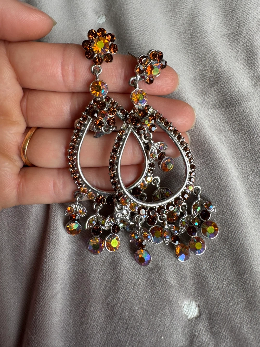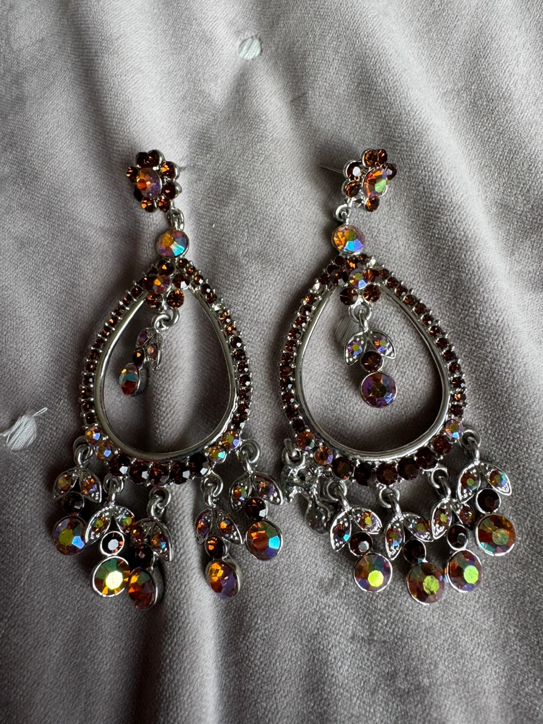 These gorgeous chandelier earrings feature an intricate design adorned with shimmering brown and orange gems. They hang elegantly, catching the light with every movement. They're perfect for adding a touch of glamour to any outfit!