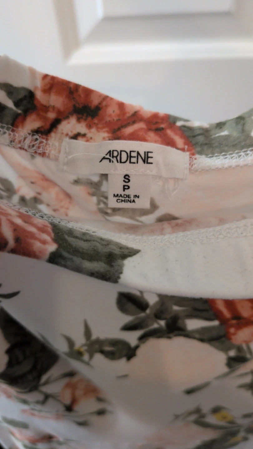 This white Ardene dress features a lovely floral print with red and pink roses and green leaves. It's a size small with a high-low hemline and an off-the-shoulder neckline if you choose to wear it that way. It's a stretchy material and flowy, it is really soft too.